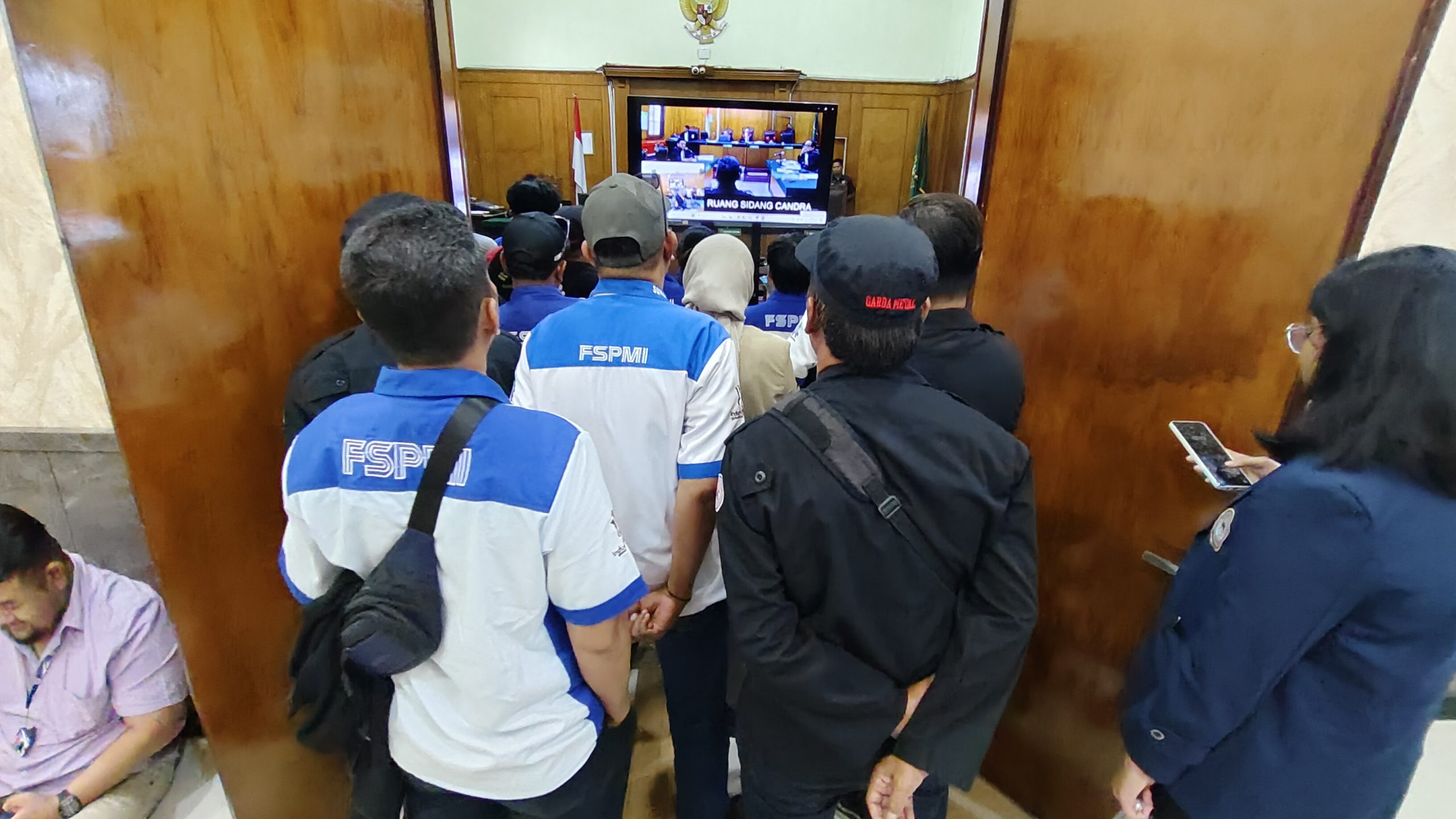 Namun akhirnya bisa masuk karena berbarengan dengan massa FSPMI yang lain dengan melewati tiga lapis pintu untuk selanjutnya bisa berasa di ruang sidang.