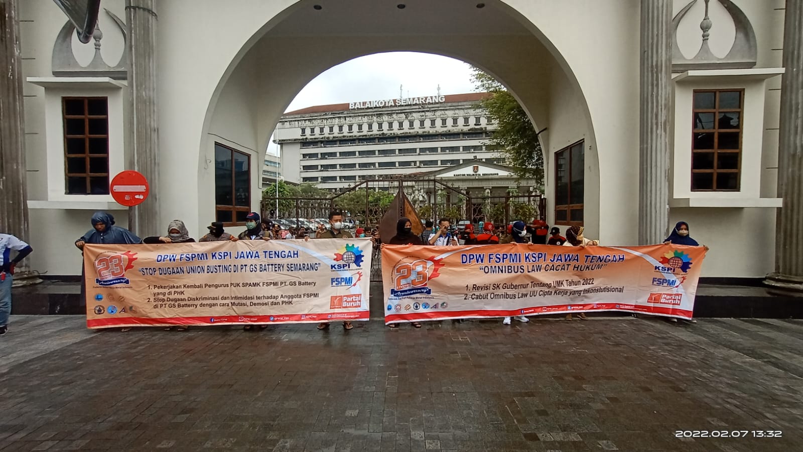 Semarang, KPOnline – Seusai berdemonstrasi di depan PT. GS Battery Semarang, ratusan buruh Federasi Serikat Pekerja Metal Indonesia (FSPMI) kembali melakukan demonstrasi di depan Balai Kota Semarang, Senin (7/2/2022).