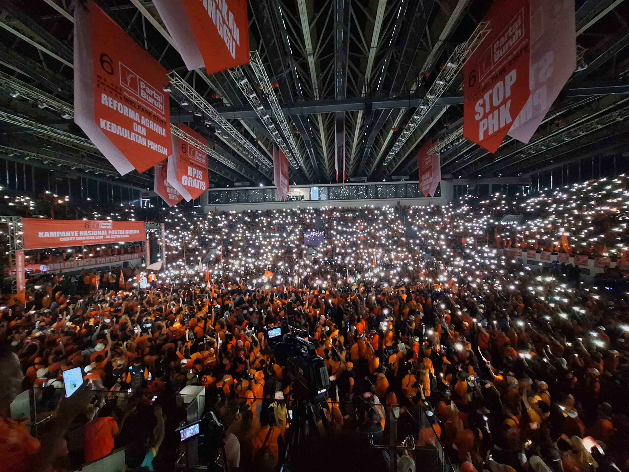 Saat detik – detik menyambut presiden partai buruh hadir di ke tengah-tengah simpatisan. Lighting area dimatikan dan seluruh yang hadir menyalakan lighting ponsel, makin terlihat kemeriahan yang sangat luar biasa. (Rojali)