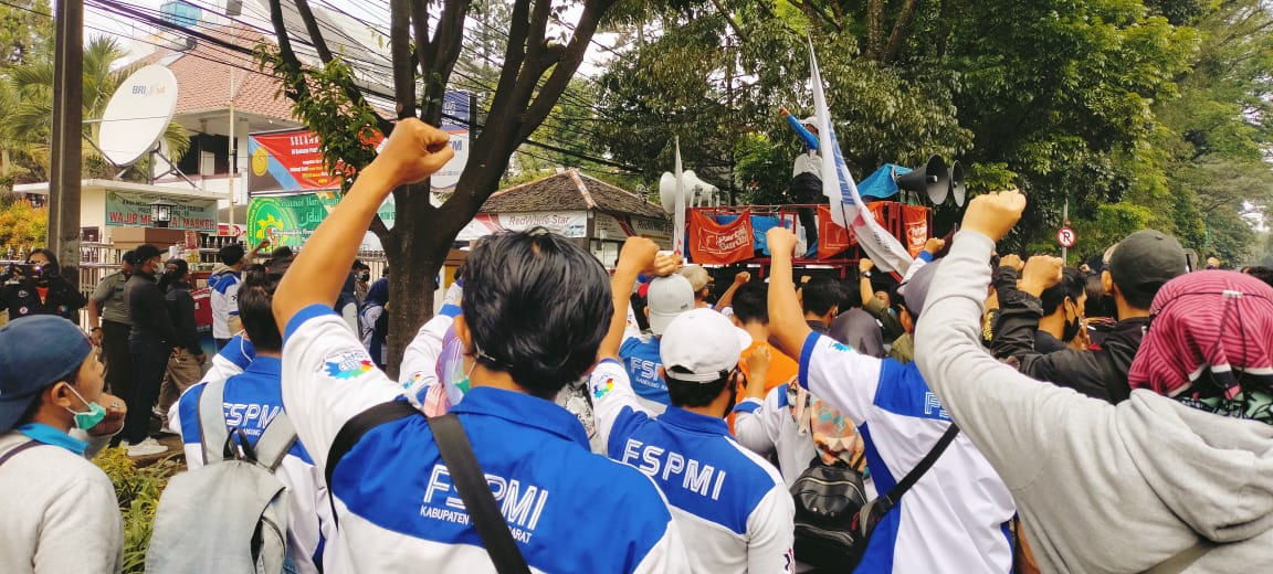 Bandung, KPonline – Digelarnya sidang ke 6 gugatan SK UMK Gubernur Provinsi Jawa Barat Tahun 2022, ratusan anggota Federasi Serikat Pekerja Metal Indonesia (FSPMI) Jawa Barat menggelar aksi unjuk rasa di depan Pengadilan Tata Usaha Negara (PTUN) Bandung, aksi berlangsung pada Hari Kamis (19/05/2022).