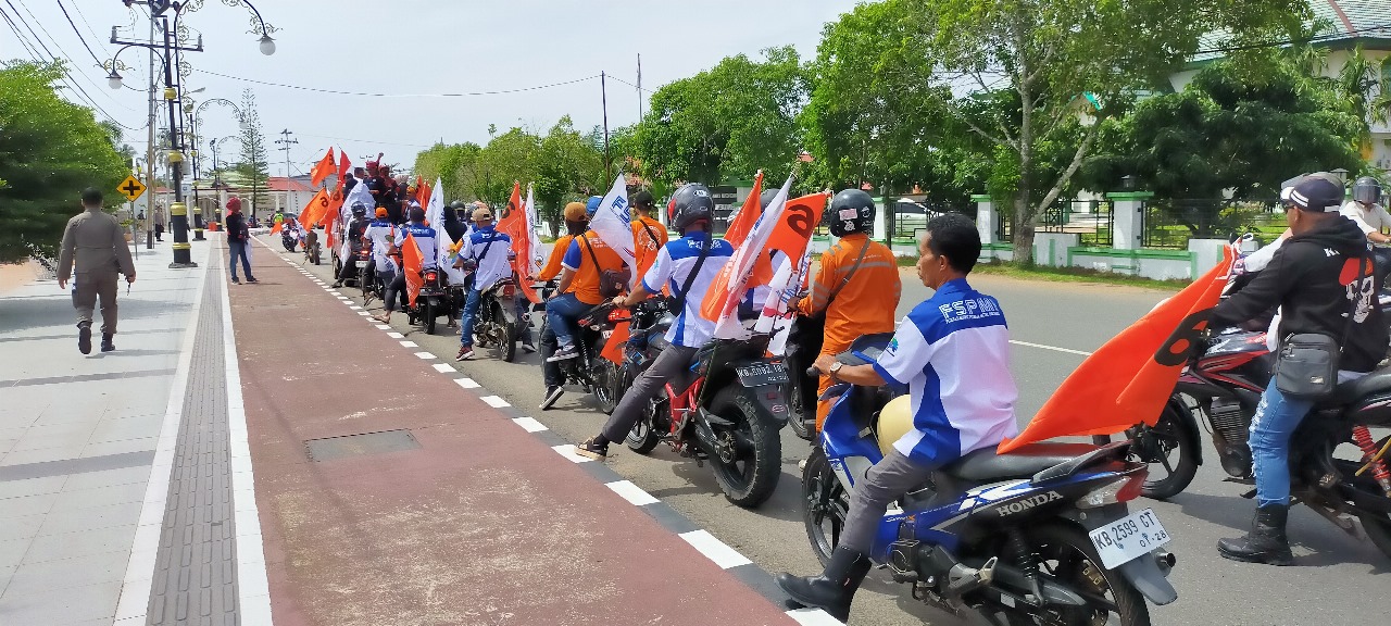Masa aksi bergerak ke Pemerintahan Kabupaten Ketapang menggunakan Mobil Komando dan motor dengan Konvoi dari KC FSPMI dengan memasang Bendera Partai Buruh di setiap Motor dan juga Mobil Komando.