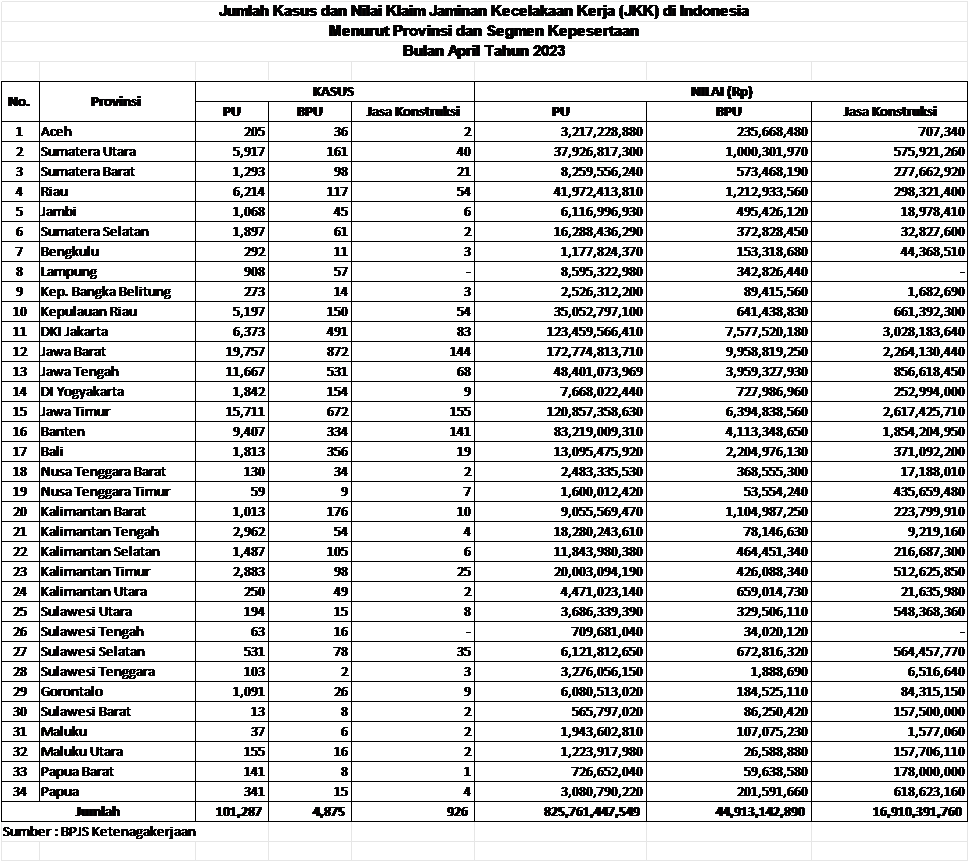 BPJS Ketenagakerjaan telah membayarkan JKK sebanyak 360.000 kasus klaim dengan total nilai Rp 2,79 miliar. Hingga periode yang sama, BPJS Ketenagakerjaan telah membayarkan JKM sebanyak 121.000 kasus klaim dengan total nilai Rp 2,94 miliar.