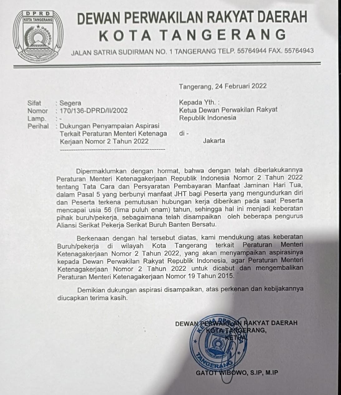 “Kami mendukung, apa yang menjadi aspirasi dan keberatan buruh/pekerja, akan kami sampaikan ke DPR-RI, agar peraturan permenaker No.2 Tahun 2022 dibatalkan dan mengembalikan permenaker No.19 Tahun 2015,” Ucap Gatot kepada massa aksi diatas mobil komando, di Depan Kantor DPRD Kota Tangerang. Kamis (24/02/2022)