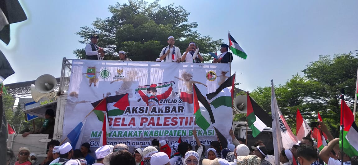 Aksi Bela Palestina kali ini dipenuhi dengan ribuan massa yang memenuhi jalan pelataran Stadion Wibawa Mukti. Mereka mengenakan baju serba putih dan mengibarkan bendera merah putih serta bendera negara Palestina.