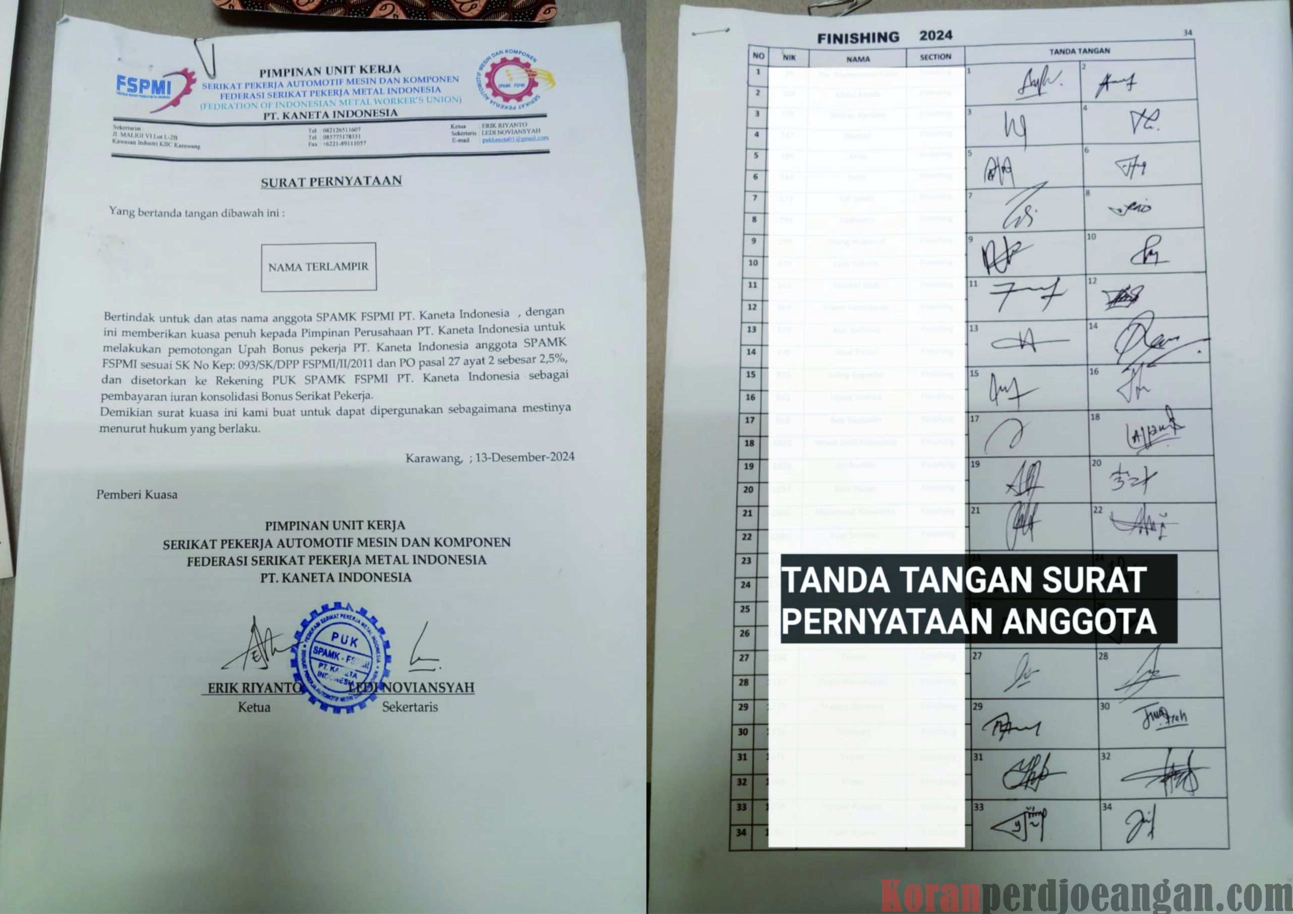 Karawang, KPonline – Beberapa waktu yang lalu PUK SPAMK FSPMI PT Kaneta Indonesia dikagetkan dengan pemberitaan disalah satu media online di karawang. Pasalnya dalam pemberitaan tersebut menyebutkan bahwa rencana pemotongan uang konsolidasi bonus tahun 2024 yang dilakukan oleh PUK SPAMK FSPMI PT Kaneta Indonesia tanpa ada kesepakatan dengan anggota.