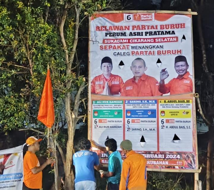 Terlihat para relawan Partai Buruh Asri Pratama hadir memasang baliho bergambar caleg partai buruh DPRD Kab. Bekasi dapil 7 (Cikarang Selatan, Cikarang Utara, Cikarang Timur) nomor urut 1. Ali Nur Hamzah, DPRD Provinsi Jawa Barat dapil 9 Kabupaten Bekasi Nomor urut 2. Sarino, S.H.,M.H dan DPR RI dapil 7 (Bekasi, Karawang, Purwakarta) nomor urut 1. H. Abdul Bais, S.E.