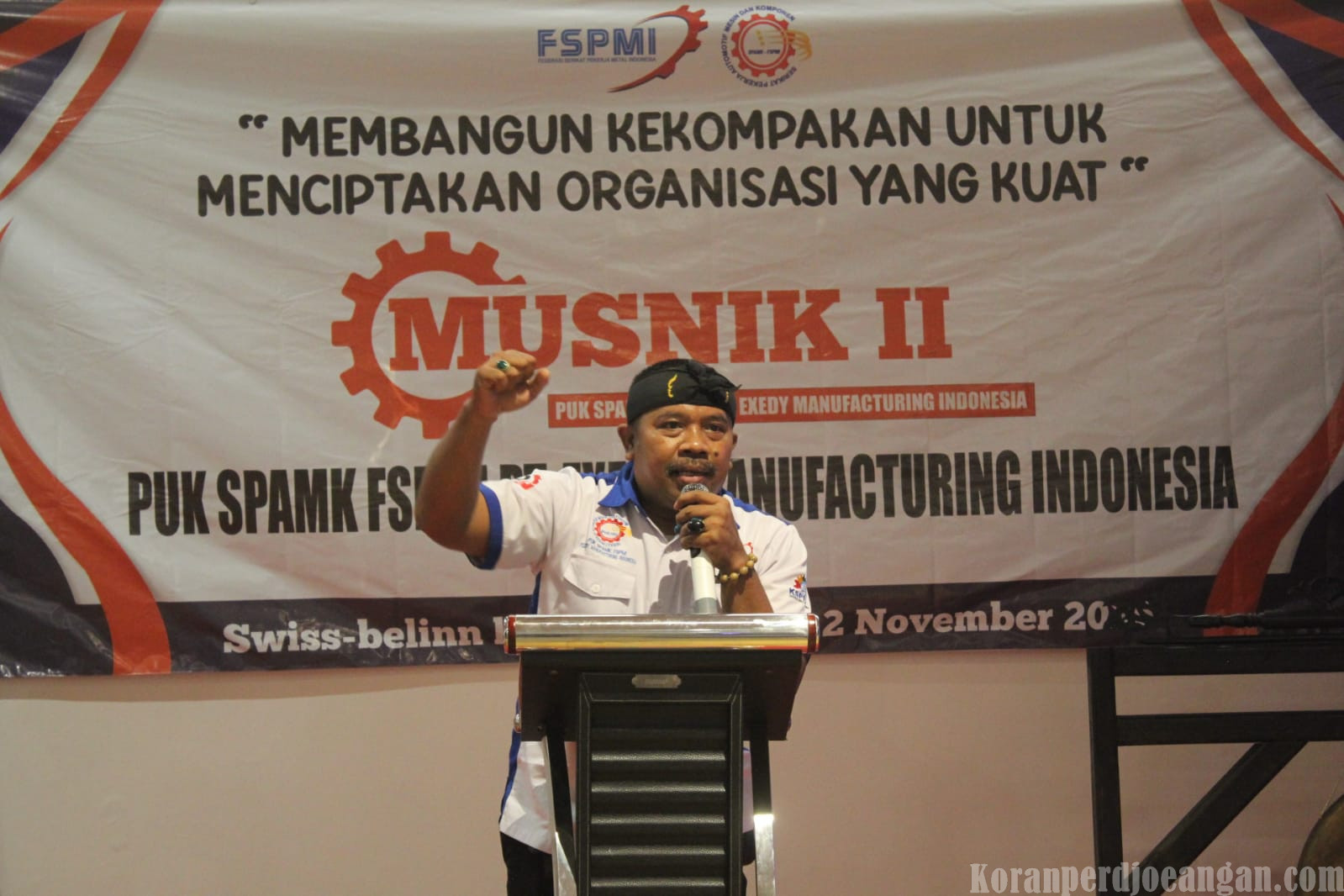 Selanjutnya, Asmat Serum, S.H., M.H., selaku Ketua Pimpinan Cabang SPAMK FSPMI Kabupaten Karawang, turut memberikan sambutan dan apresiasi atas terselenggaranya MUSNIK yang berjalan dengan tertib dan demokratis.