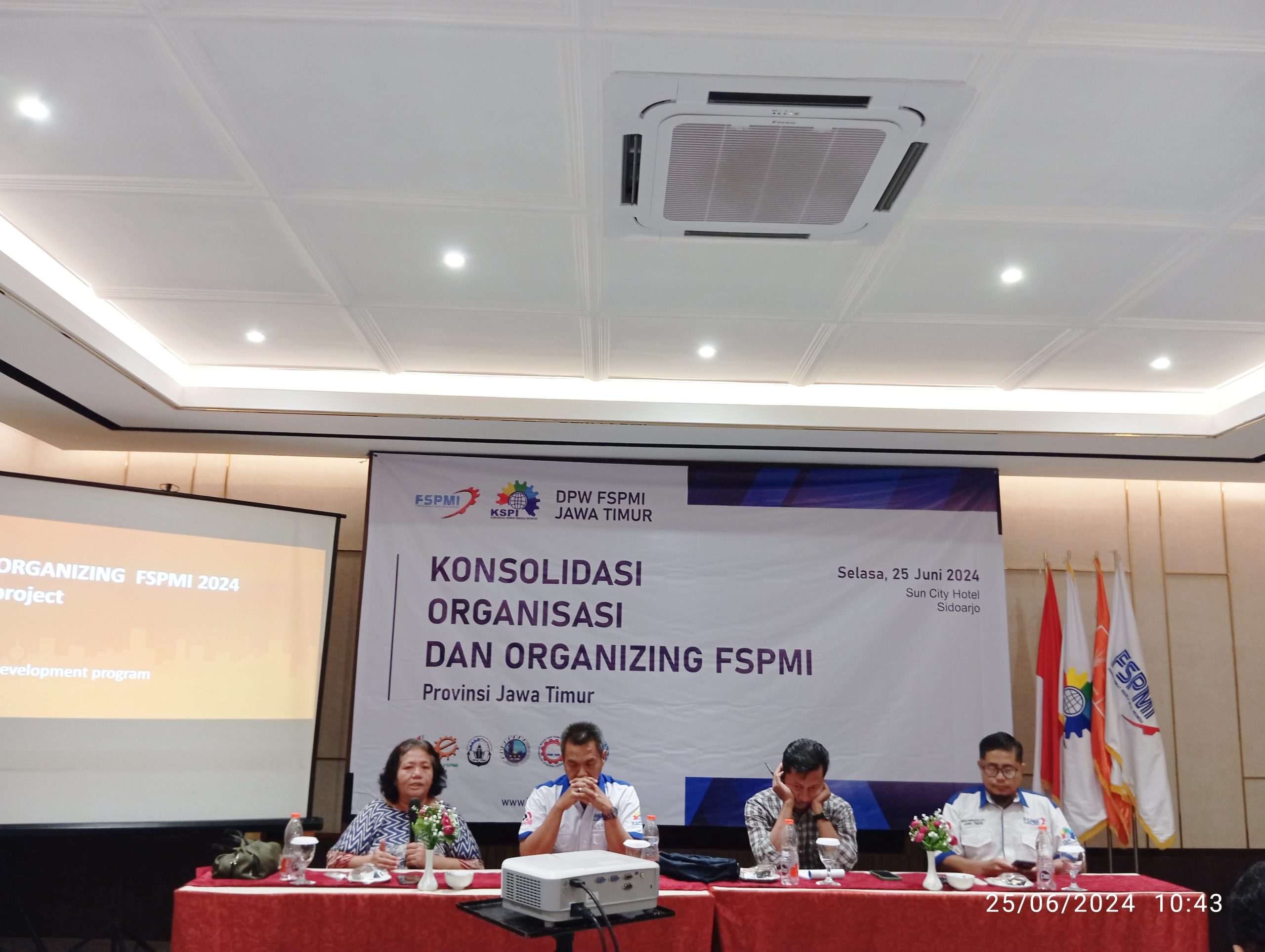 Sidoarjo, KPonline – DPW Federasi Serikat Pekerja Metal Indonesia (FSPMI) Provinsi Jawa Timur mengadakan acara Konsolidasi Organisasi Dan Organizing yang bertempat di Sun City Hotel, Sidoarjo, pada hari Selasa 25 Juni 2024. Acara ini dihadiri oleh pengurus baik KC atau PC semua sektor FSPMI Jawa Timur (Jatim) dengan tujuan memperkuat struktur organisasi dan menyusun strategi untuk masa depan.