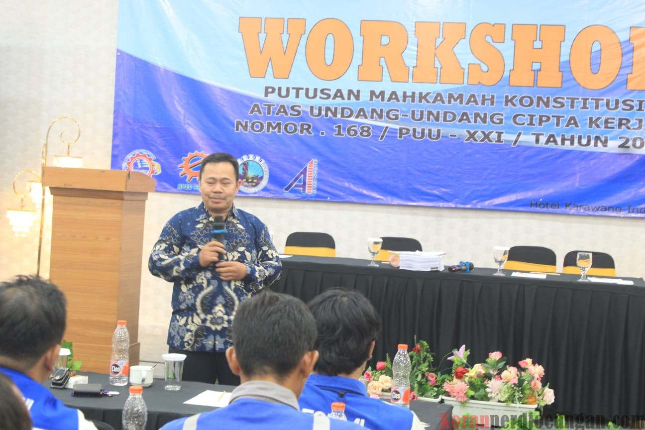 Ketua Konsulat Cabang FSPMI Karawang, Asmat Serum, S.H.,M.H, dalam sambutannya menyampaikan pentingnya workshop ini untuk memastikan anggota FSPMI memahami dampak putusan tersebut.