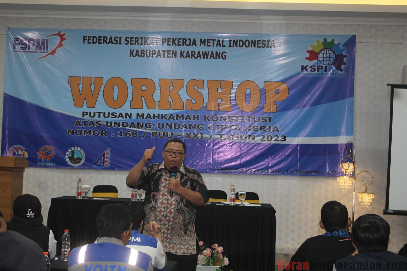 Karawang, KPonline – Konsulat Cabang Federasi Serikat Pekerja Metal Indonesia (FSPMI) Kabupaten Karawang hari ini menggelar workshop yang membahas Putusan Mahkamah Konstitusi (MK) Nomor : 168/PUU-XXI/2023 terkait Undang-Undang Cipta Kerja. Workshop ini bertempat di Hotel Grand Karawang Indah di Karawang dan dihadiri oleh seratus lima belas peserta dari berbagai Sektor Industri dalam naungan FSPMI Kabupaten Karawang