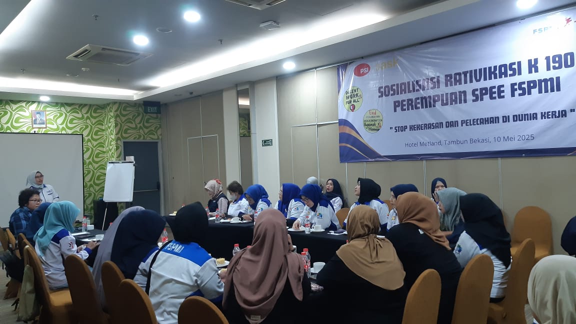 Bekasi, KPonline – Pimpinan Pusat SPEE FSPMI mengadakan Sosialisasi Rativikasi K190 Perempuan SPEE FSPMI – Stop kekerasan dan pelecehan di dunia kerja, di Metlan Hotel Tambun Bekasi, Sab’tu pagi (10/05/25).