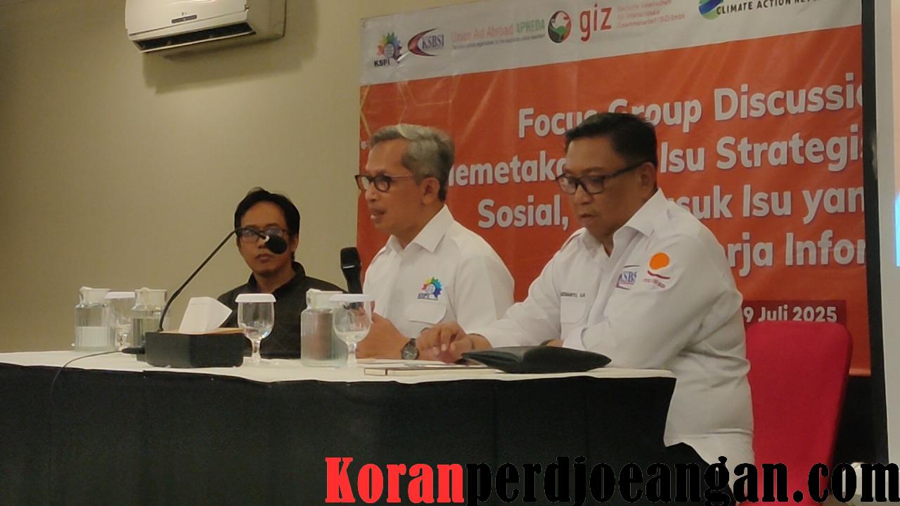 Jakarta, KPonline – Konfederasi Serikat Pekerja Indonesia (KSPI) menggelar Focus Group Discussion (FGD) bertajuk “Mapping Issues for Social Dialogue (Including Informal Workers Issues)” di Favehotel PGC Cililitan, Jakarta Timur, Selasa, 29 Juli 2025. Kegiatan ini bertujuan untuk menghimpun masukan awal dalam merancang agenda dialog sosial menuju transisi ekonomi yang adil dan berkelanjutan.