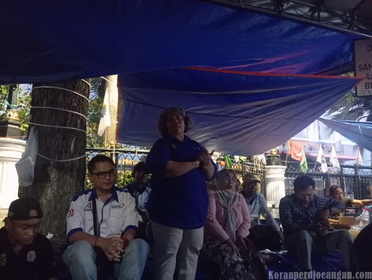 “Kehadiran kalian di tenda juang ini adalah bukti nyata, bahwa buruh tidak pernah sendirian,” katanya.
