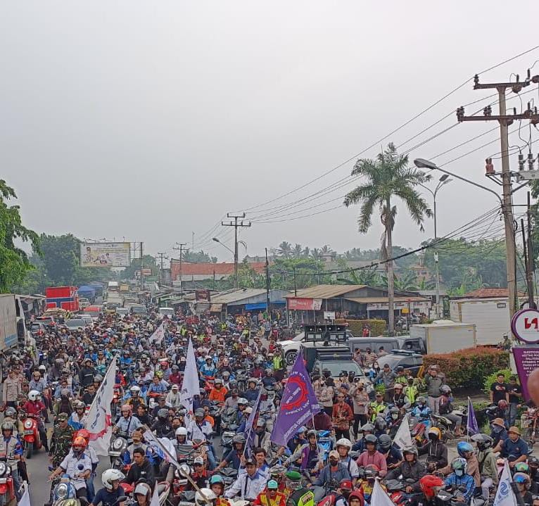 Sebelum menuju Kantor Gubernur, Massa aksi kembali menyisir Kawasan Industri Modern Cikande menjemput masa aksi untuk bergabung dalam barisan.