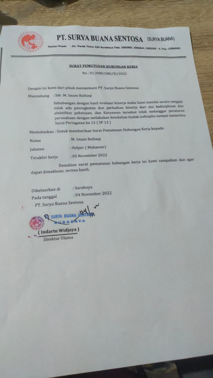 “Maka kami selaku pengurus DPW FSPMI Sulawesi Selatan akan membuat berita besar besaran dan aksi besar besaran terhadap perampasan HAK kaum buruh yang terjadi di PT. Surya Buana Sentosa sampai pihak manajemen mempekerjakan kembali seluruh anggota PUK SPAI FSPMI PT. Surya Buana Sentosa”, lanjutnya.