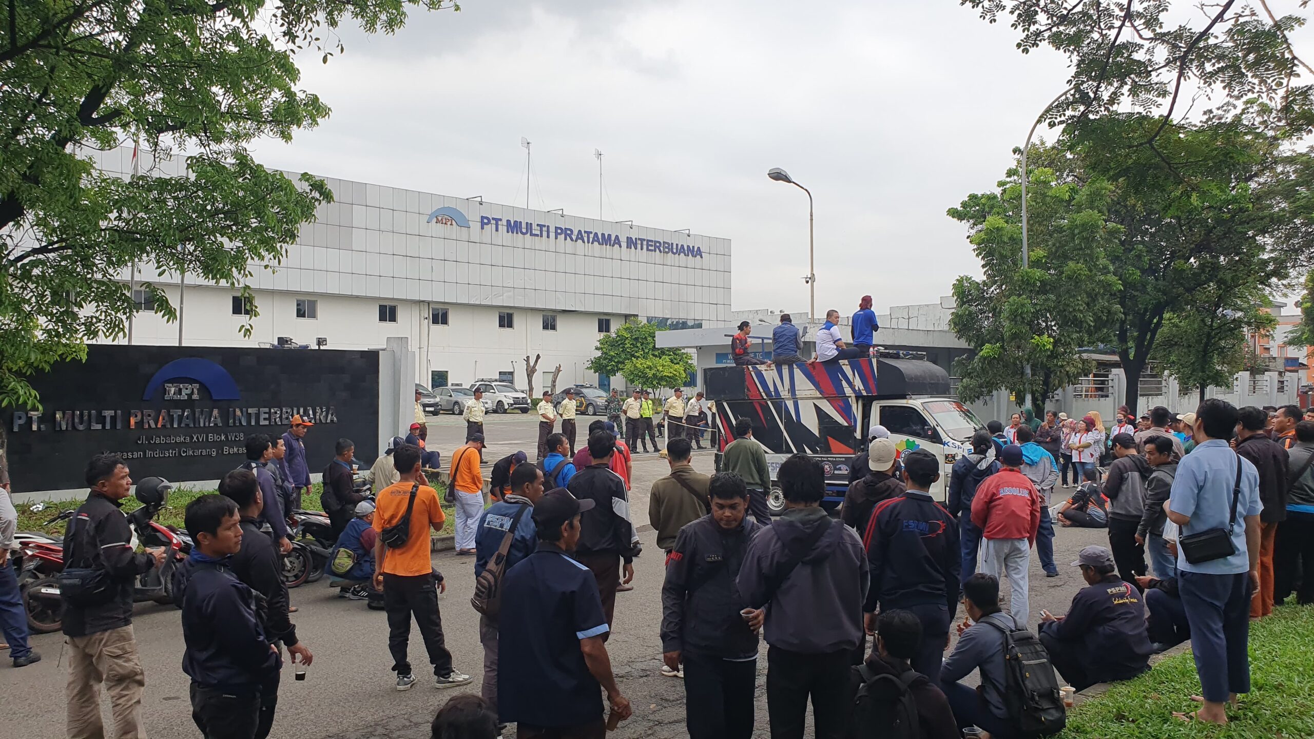 Bekasi, KPonline – Mobil pengeras suara atau biasa dikenal dengan mobil komando FSPMI bersama ratusan massa buruh yang terus berdatangan di depan PT. Multi Pratama Interbuana pada Rabu (18/6/2025) pagi hingga siang.