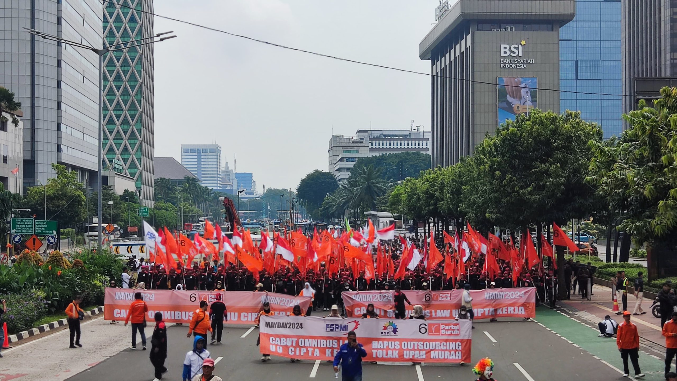 Aksi May Day 2024 diawali dengan longmarch yang dilakukan oleh peserta aksi dari depan Kantor Balaikota Jakarta menuju perempatan Sarinah, kemudian kembali ke Patung Kuda Arjuna Wijaya, persimpangan, Jl. M.H. Thamrin Jl. Medan Merdeka Barat, Gambir, Jakarta Pusat. Rabu, (1/4).