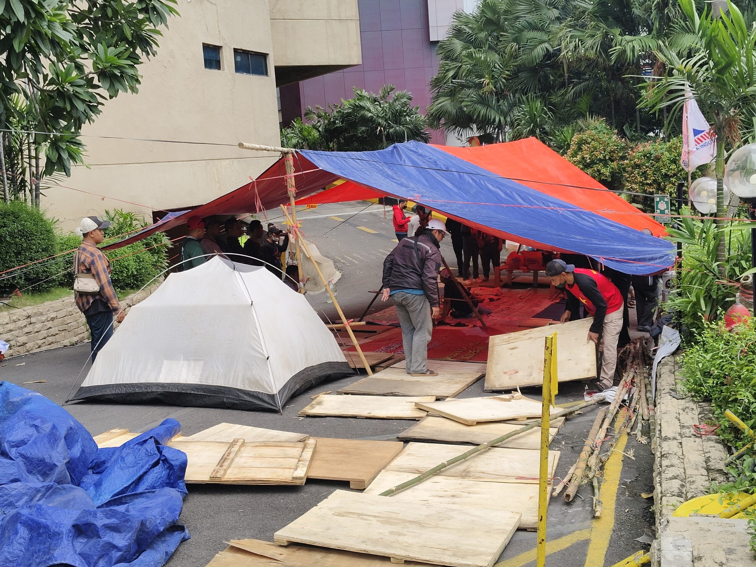 Surabaya, KPonline – Aksi mogok kerja Karyawan Hotel Tunjungan yang tergabung dalam PUK SPAI FSPMI PT. Tunjungan Crystal Hotel Surabaya terus berlanjut meski menghadapi berbagai tekanan. Pada Selasa, 17/03/2025, tenda mogok kerja yang didirikan oleh Pimpinan Unit Kerja Serikat Pekerja Aneka Industri Federasi Serikat Pekerja Metal Indonesia (PUK SPAI FSPMI) PT. TCH Surabaya akhirnya harus dipindahkan ke lokasi yang lebih masuk ke dalam yakni di area hotel. Perpindahan ini dikarenakan sebelumnya tenda mogok kerja didirikan di trotoar depan hotel.