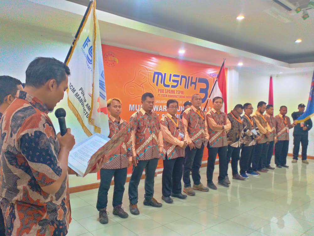 Ketua terpilih, Kuszairi menyebutkan satu per satu susunan pengurus hasil sidang formatur. Nama nama yang dipanggil langsung menuju depan panggung untuk dilakukan pelantikan. Adapun susunan pengurus PUK SPAMK FSPMI PT. FSCM Manufacturing Indonesia periode 2022-2025 adalah :
