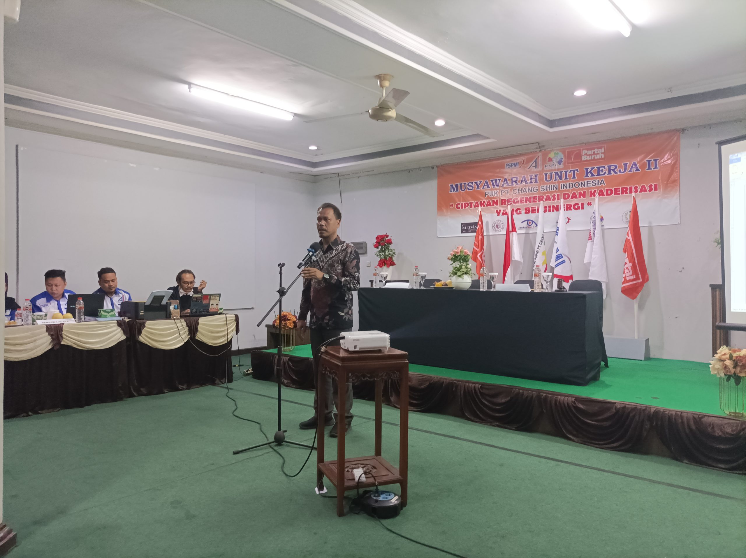 Kemudian sambutan selanjutnya sekaligus membuka secara resmi Agenda Musnik II PUK SPAI FSPMI PT. Chang Shin Indonesia dari Ketua PC SPAI FSPMI Kabupaten Karawang Rahmat Binsar, S.T. menyampaikan tujuan dan membuat Program Kerja yang efektif supaya lebih optimal nantinya.