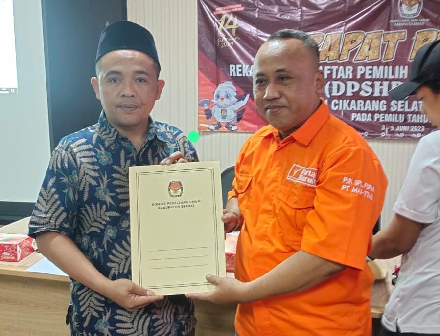 Bekasi, KPonline – Rapat Pleno Terbuka Rekapitulasi Perubahan Pemilih Untuk DPSHP Akhir Kecamatan Cikarang Selatan diselenggarakan pada Senin (5/6/2023) di kantor Camat Cikarang Selatan, Jl. KH Raden Ma’mun Nawawi, Desa Sukadami, Kec. Cikarang Selatan Kabupaten Bekasi.