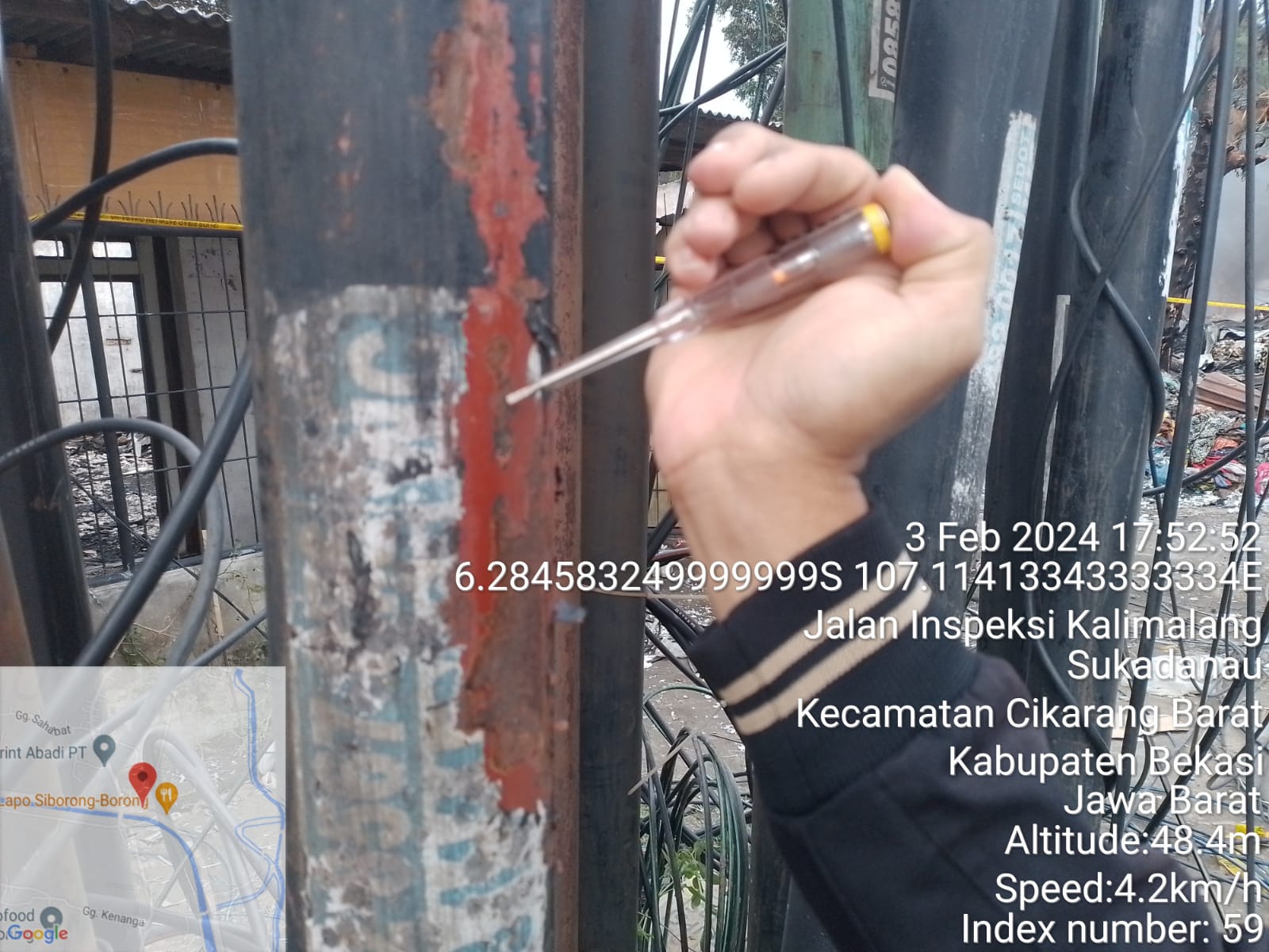 “Iya, Bang. Tadi saya kesetrum,” ujar seorang pekerja jaringan internet sambil menunjuk ke arah tiang yang dia maksud dan memperlihatkan luka akibat setrum di pinggangnya.