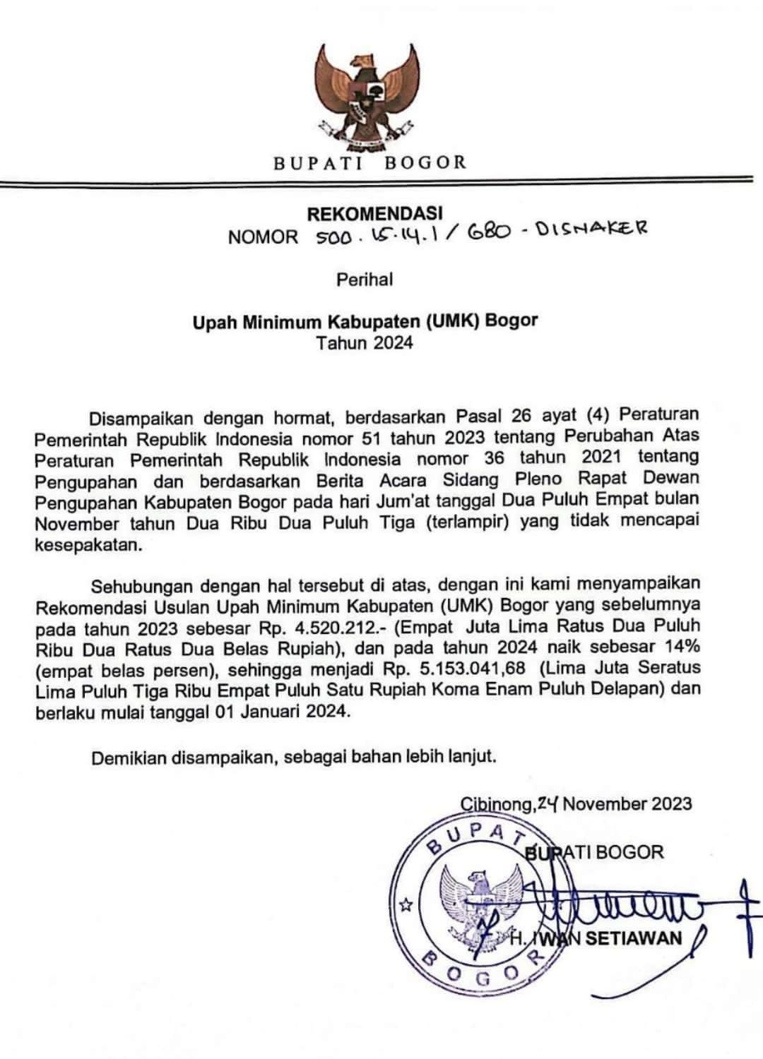 Setelah ditandatangani surat rekomendasi kenaikan Upah Minimum Kabupaten Bogor sebesar 14% tersebut, maka para buruh akan mengawal angka tersebut di tingkat Provinsi. (24/11/2023)