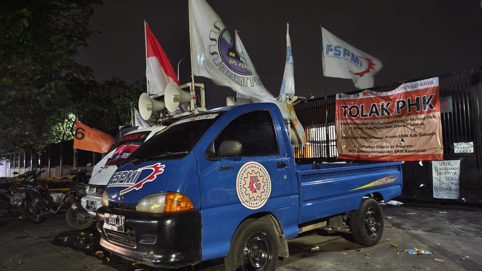 Sidoarjo, KPonline – Malam ini Sabtu 25 Maret 2023 , Di depan gerbang UD Raya yang berada di Pilang , Wonoayu,Sidoarjo masih terlihat dua mobil Komando FSPMI dan kain yang dibentangkan untuk tempat berteduh.