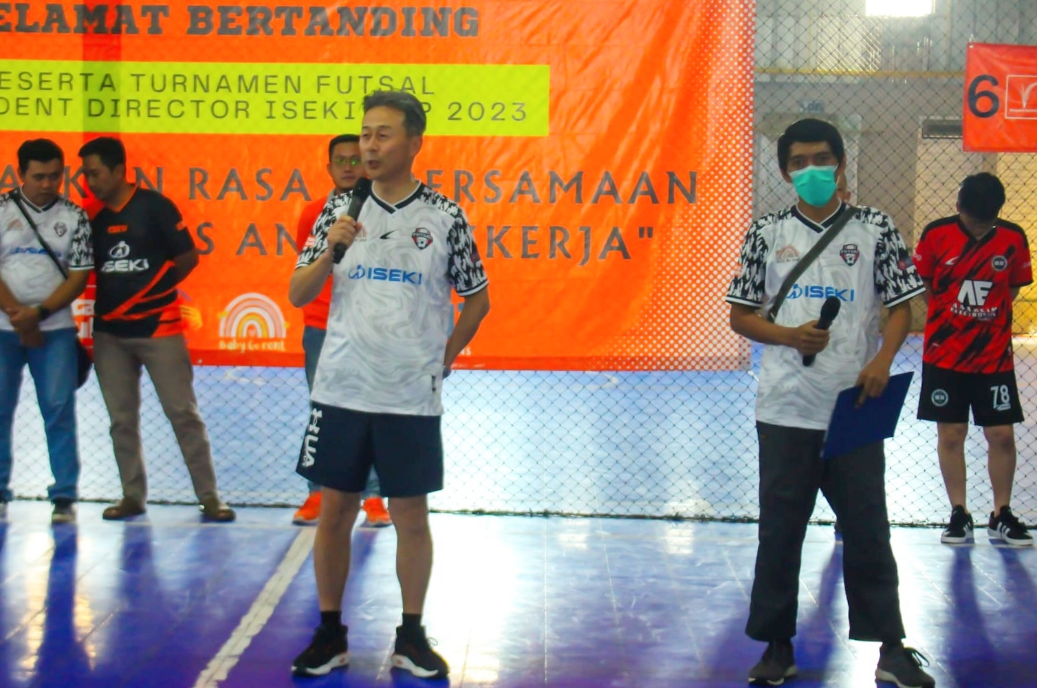 Setelah mengakhiri sambutannya, Presiden Direktur secara resmi membuka acara Turnamen Futsal Iseki Cup 2023 yang ditandai dengan menendang bola ke arah gawang.