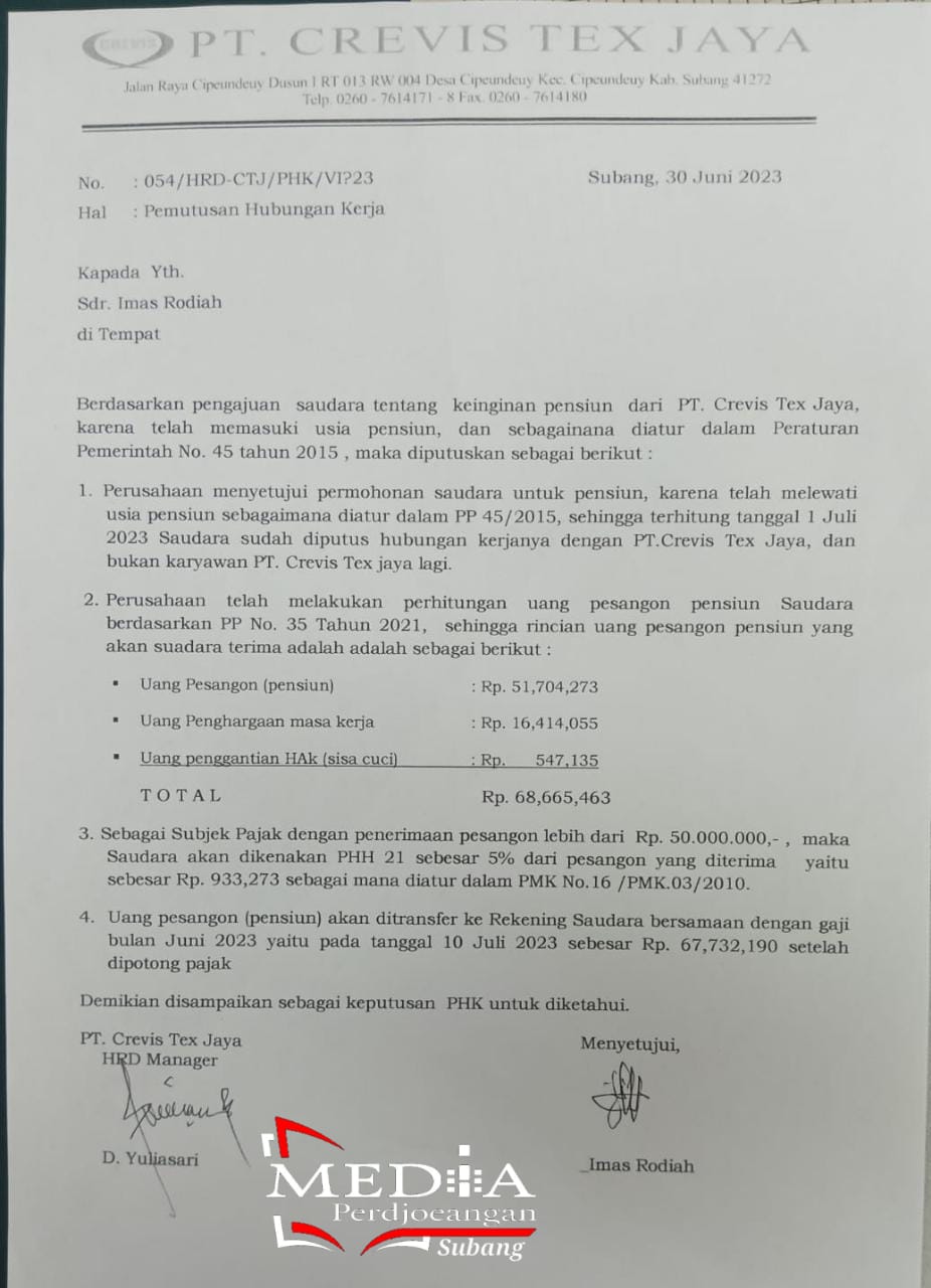 Dan akhirnya PT Crevis Tex Jaya memutuskan untuk pesangon Imas Rodiah berdasarkan PP nomor 35 tahun 2021 dan ketika di tanyakan oleh Sandi, sdri Imas Rodiah akhirnya menerima keputusan tersebut, yang mana kompensasi yang di dapatkan dengan masa kerja 12 tahun 6 bulan ( UMK X masa kerja X 1,75 persen ) yang nilainya sebesar Rp.68.665.463,- ( enam puluh delapan juta enam ratus enam puluh lima ribu empat ratus enam puluh tiga rupiah )