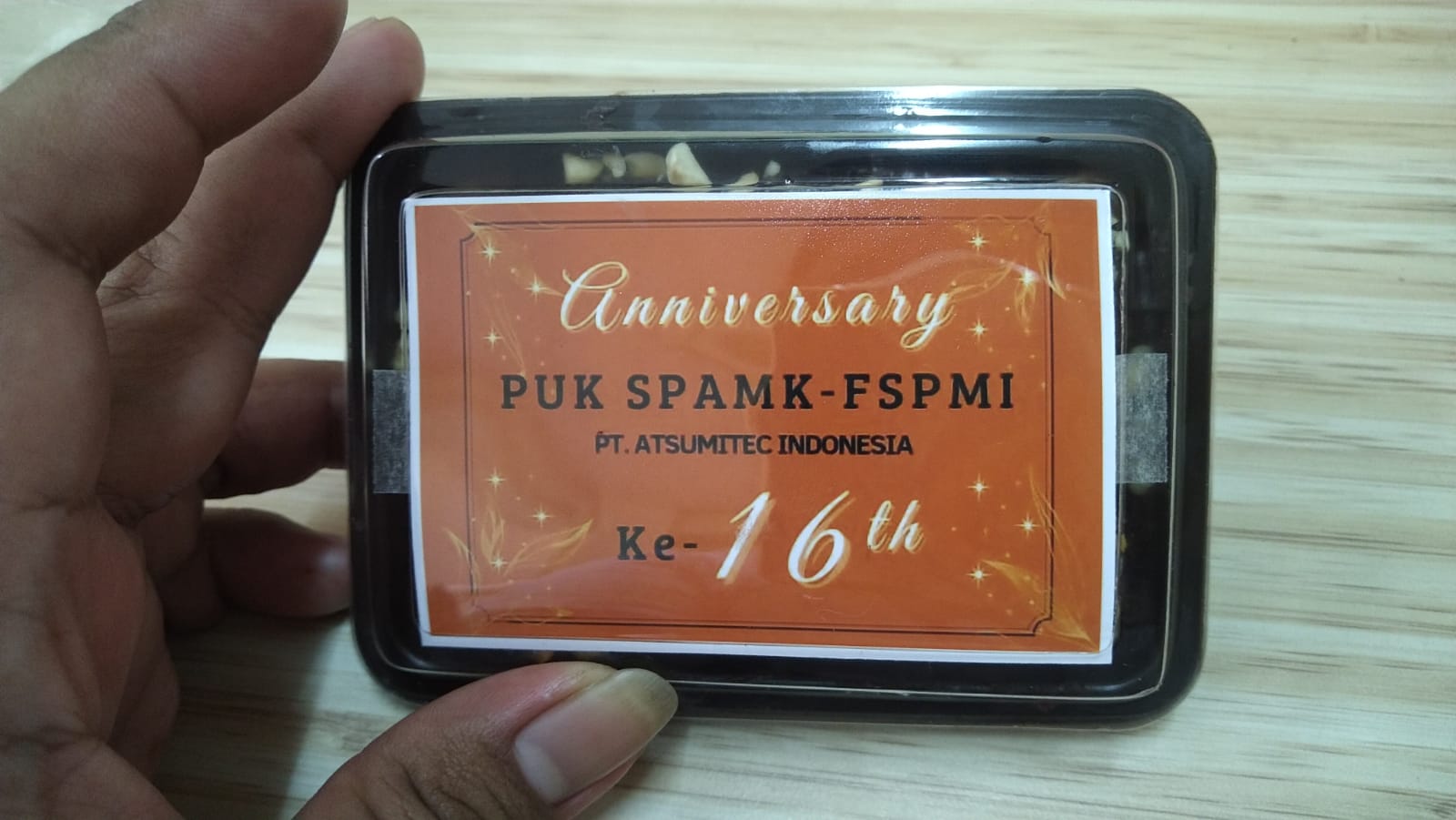Dalam ceremony tersebut juga diadakan potong tumpeng dan berbagi Kue yang bertulisan Anniversary PUK SPAMK FSPMI PT. Atsumitec Indonesia yang ke 16 sebagai tanda syukur dan membagikannya kepada seluruh anggota yang hadir dan juga management perusahaan.