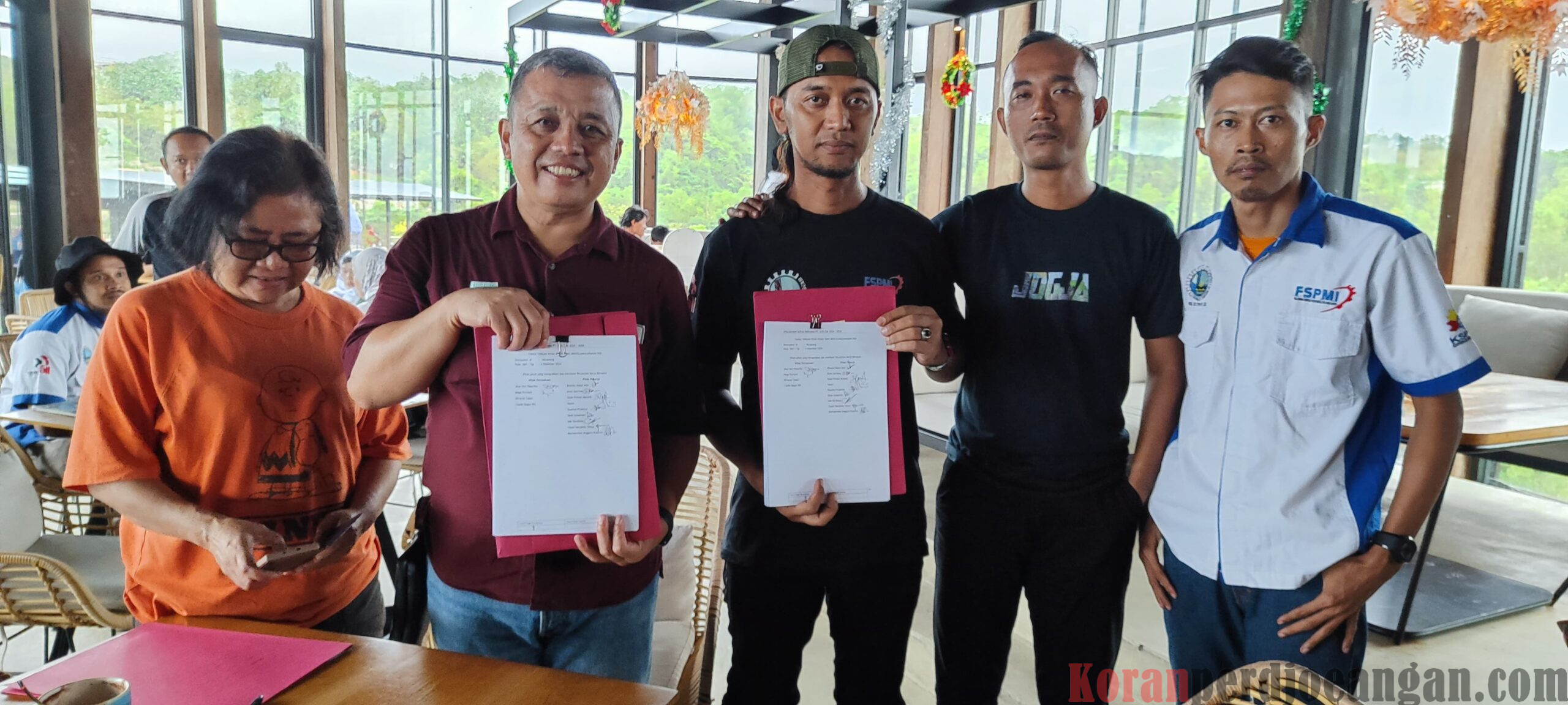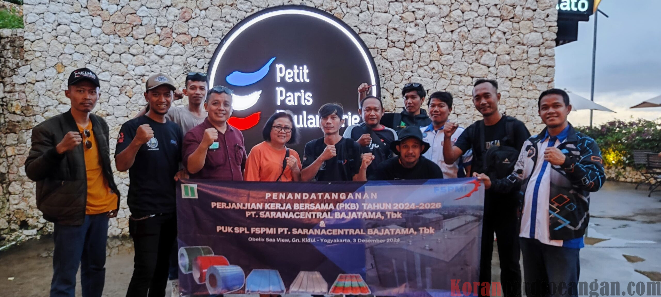 Penandatanganan PKB yang dilaksanakan di Obelix Sea View Gunung Kidul Yogyakarta pada Selasa (03/12/2024) dihadiri dari pihak Manajemen di antaranya Mega Purnami dan Jhon Veri Pasaribu. Sedangkan dari Pengurus PUK SPL FSPMI PT. Saranacentral Bajatama, Tbk dan Team Perunding PKB dihadiri oleh Ridwan Abdul Aziz, Hasan, S.Pd.I., Dede Firman Mutalib, Suyatno Prasetyo, Entis Sutrisna, A.Md., Yayan Heryanto Yahya, Mochammad Anggara Kusuma, Ade Nurdiana, S.T., Asep Budi Supriatno, Ahmad Yani dan Dede Sulaeman.