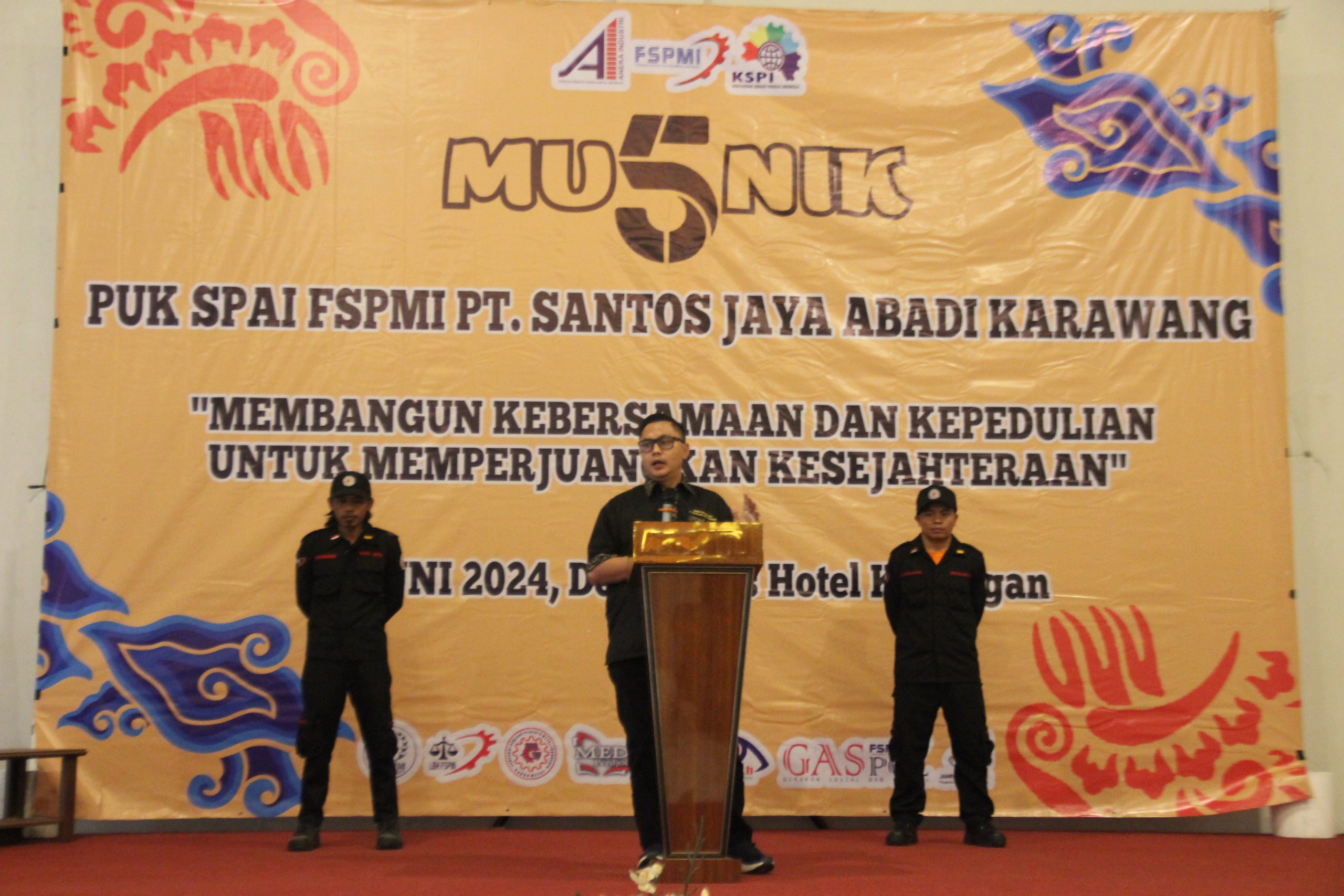 Di awali dengan menyanyikan lagu kebangsaan Indonesia Raya dan Mars FSPMI yang dilanjutkan dengan pembacaan Ayat Suci Al Qur’an dan Film Dokumenter dari Infokom PUK, yang kemudian dilanjutkan dengan sambutan – sambutan, Sambutan yang pertama dari Ketua Pelaksana Musnik V PUK SPAI FSPMI PT. Santos Jaya Abadi Pono Hartomo, S.T., Kemudian yang kedua sambutan dari Ketua PUK SPAI FSPMI PT. Santos Jaya Abadi Wawan Junianto, Management PT. Santos Jaya Abadi Bapak Hermawan Widi, Perwakilan Disnakertrans Karawang Ibu Friskawati, Selanjutnya Ketua Umum PP SPAI FSPMI Bambang Santoso, S.H., Presiden FSPMI Riden Hatam Aziz, S.H. dan Sambutan yang terakhir sekaligus membuka Agenda Musnik secara resmi oleh Rahmat Binsar, S.T. sebagai ketua PC SPAI FSPMI Kabupaten Karawang.