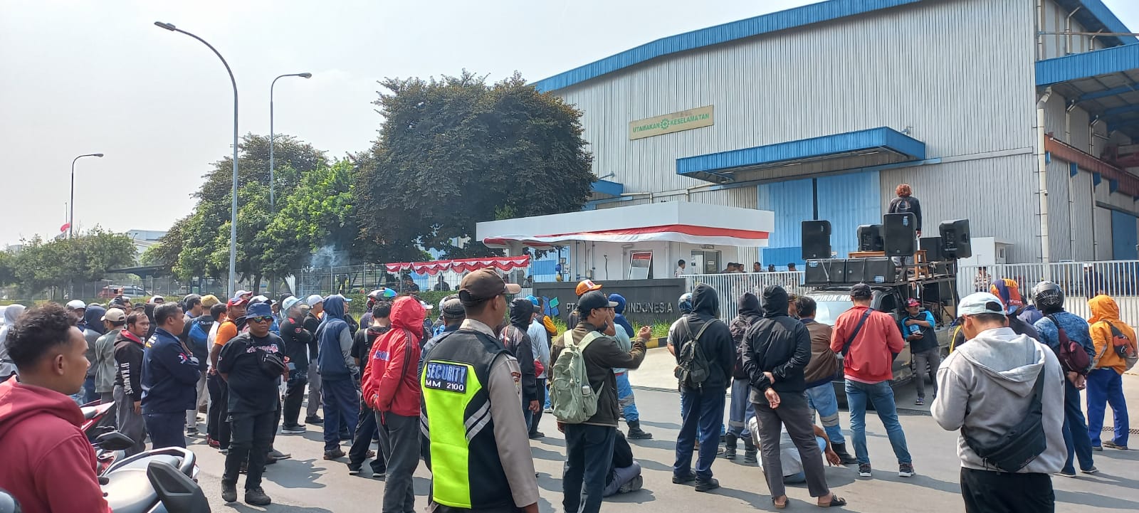 Aksi yang rencananya dilaksanakan selama tiga hari ini dipimpin langsung oleh ketua forum silaturahmi serikat pekerja MM2100 Eko Budiman. Hadir juga dari Pimpinan Cabang PC SPAMK FSPMI Kab/Kota Bekasi Sutarno dan Sunariyadi.