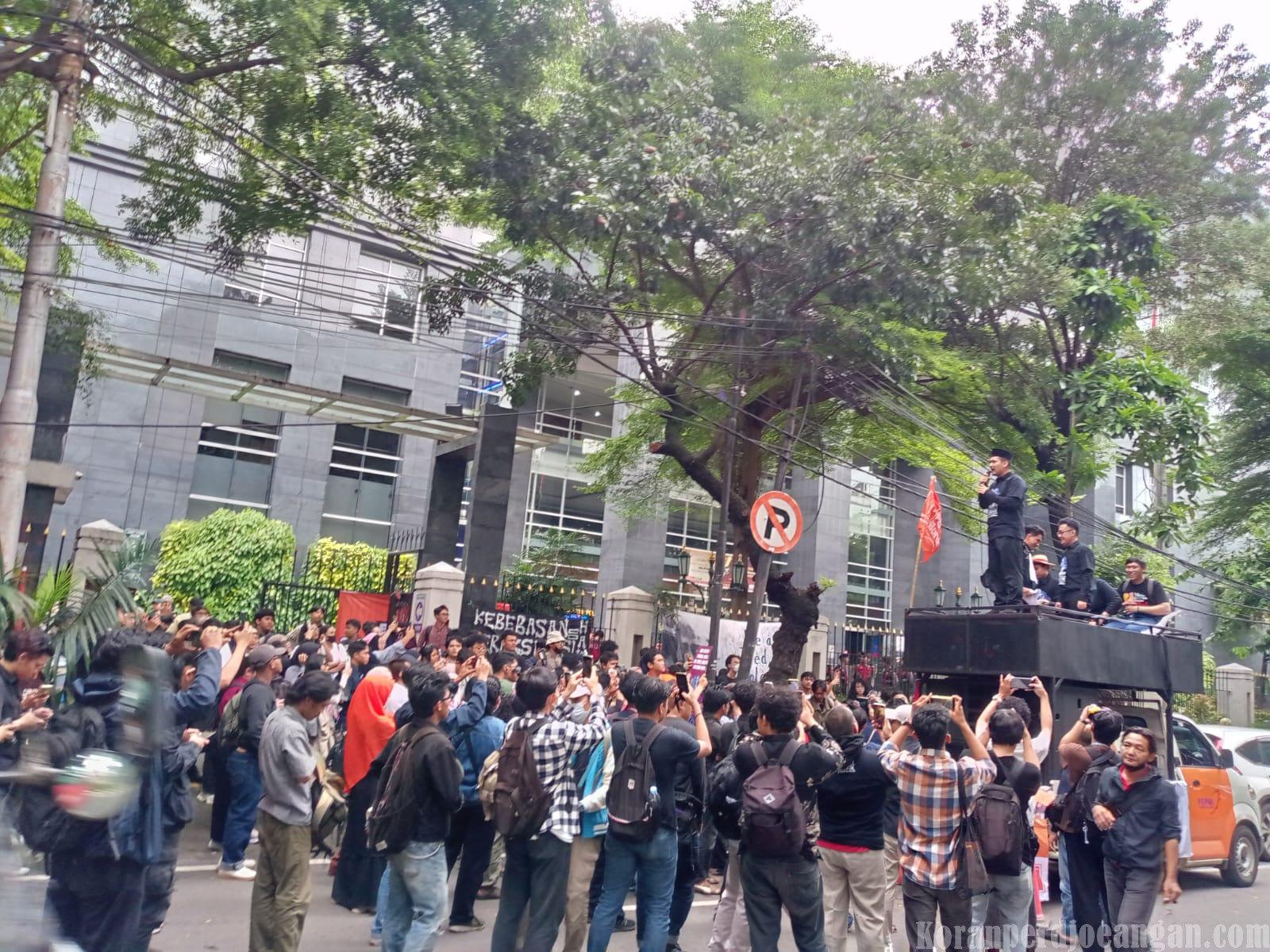 Aksi ini dipimpin langsung oleh Komandan Lapangan Bidang Aksi, Rifqi Mubarok, yang mengoordinasikan jalannya demonstrasi agar tetap berlangsung tertib. Ia menegaskan bahwa massa aksi fokus mengawal jalannya sidang hingga pembacaan putusan.
