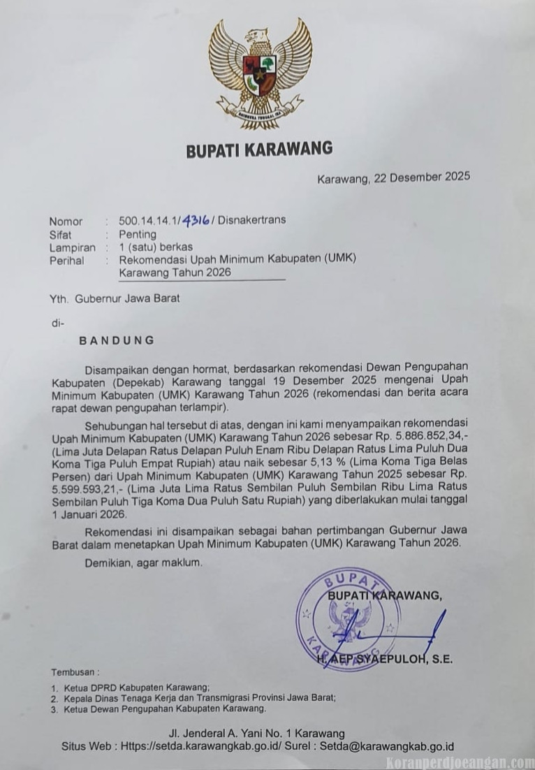 Karawang, KPonline – Bupati Karawang secara resmi menyampaikan rekomendasi Upah Minimum Kabupaten (UMK) Karawang Tahun 2026 kepada Gubernur Jawa Barat. Rekomendasi tersebut tertuang dalam surat bernomor : 500.14.14.1/4316/Disnakertrans tertanggal 22 Desember 2025.