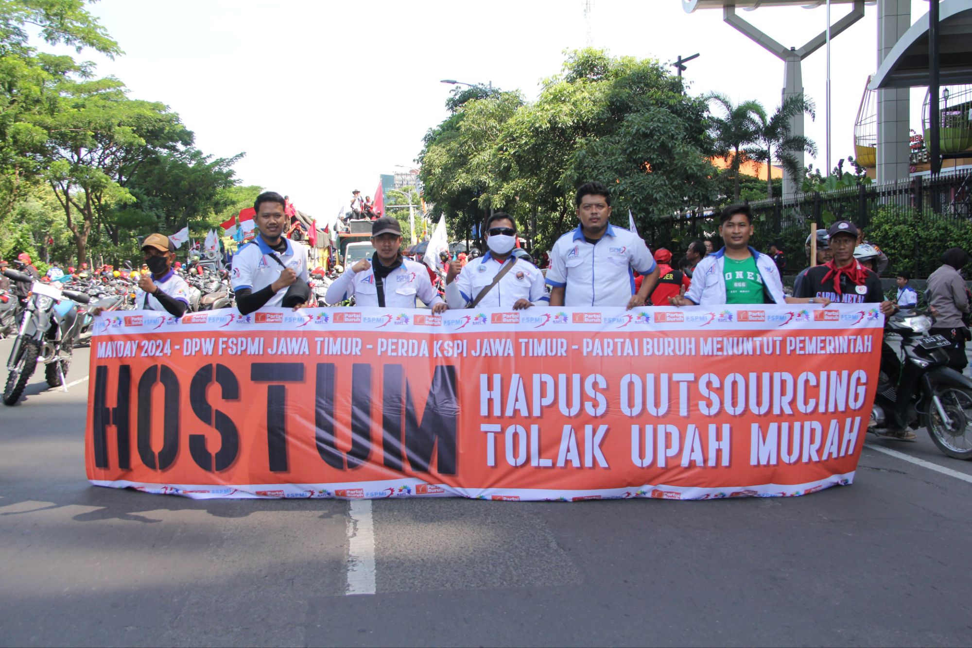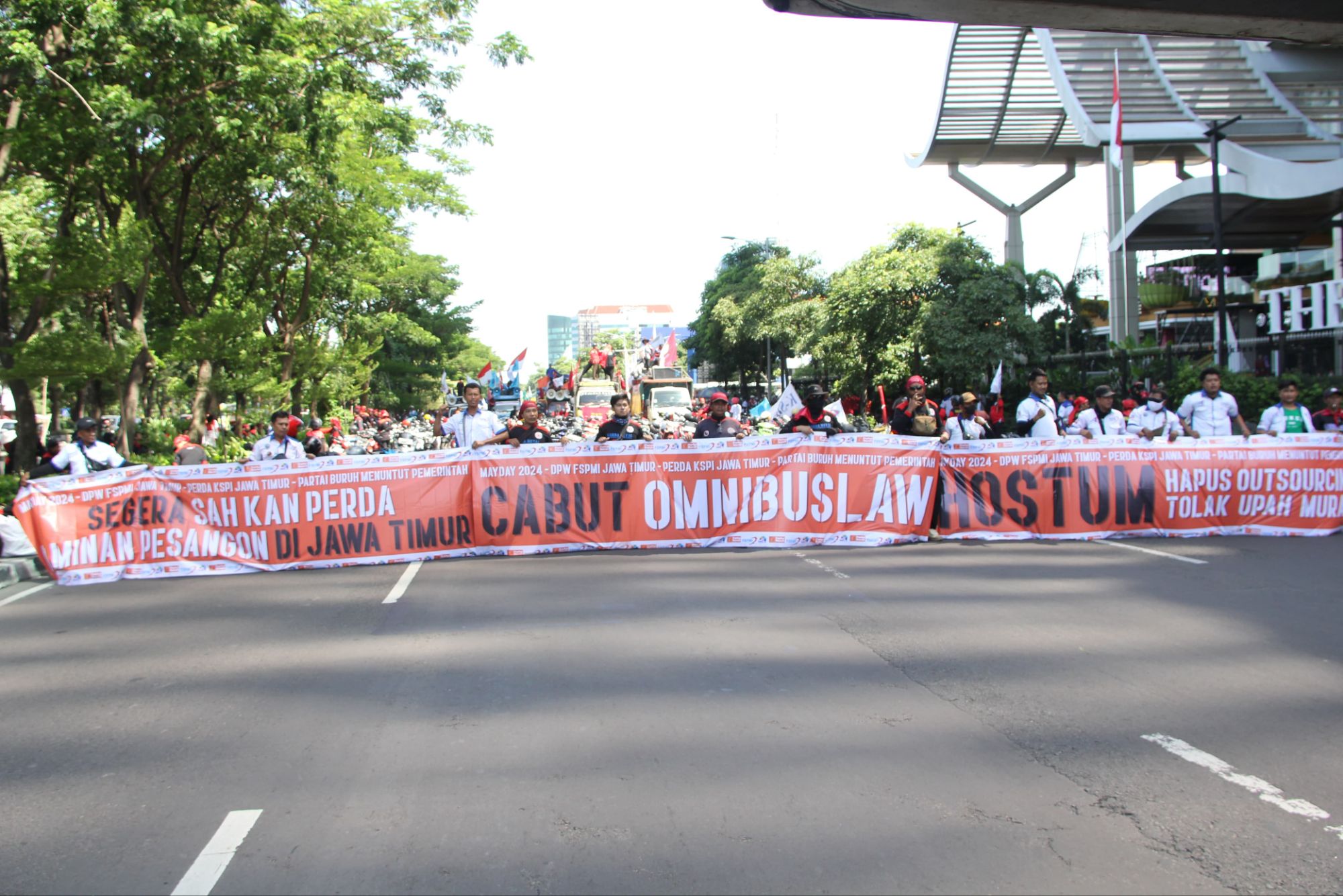 Dibawah pengawalan ketat dari Kepolisian, massa aksi melaju perlahan menuju pusat kota Surabaya. Di tengah kegembiraan merayakan solidaritas pekerja, mereka juga menyerukan sejumlah tuntutan yang dianggap penting: