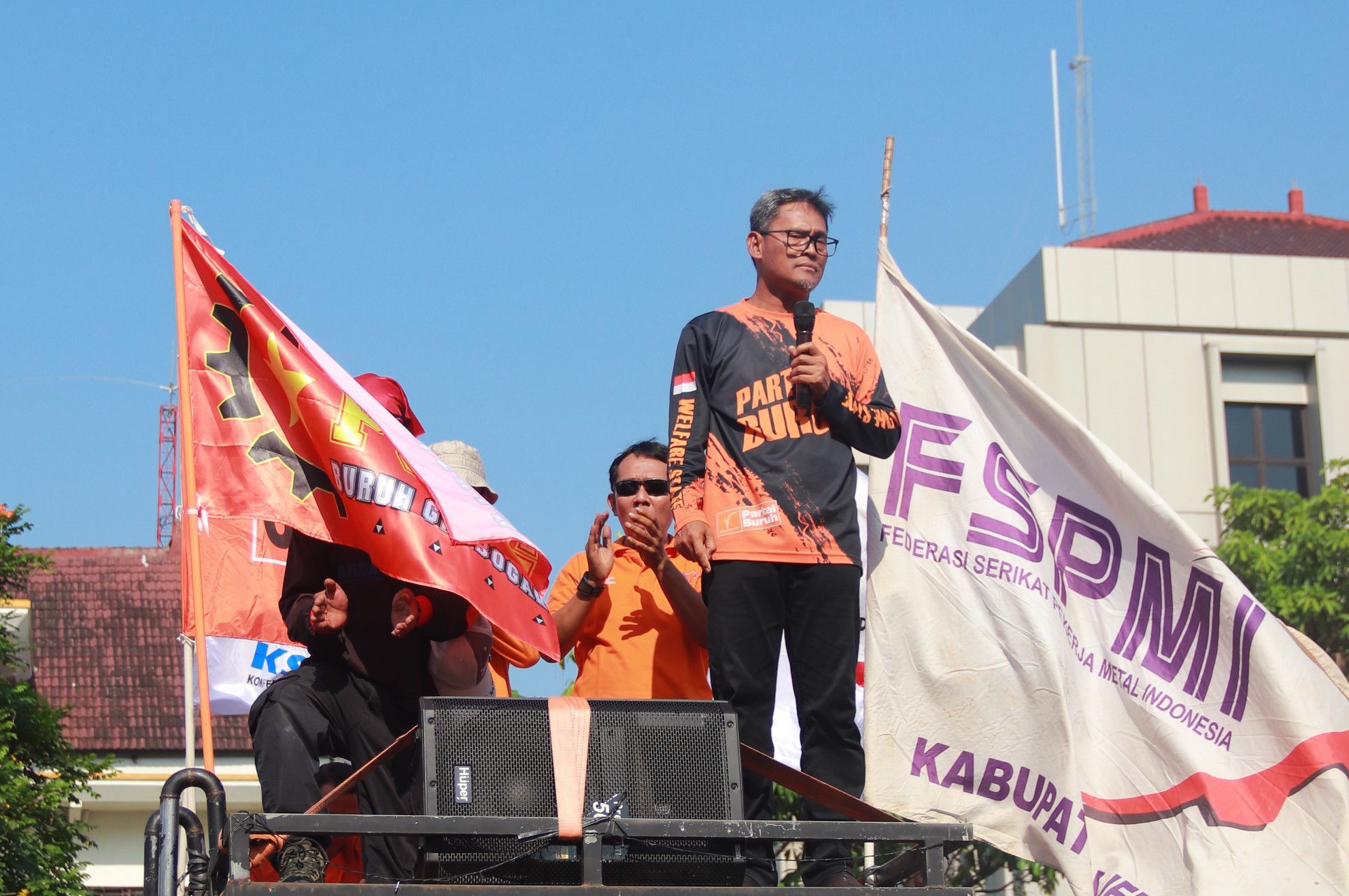 Dalam orasinya Riden Hatam Azis menyampaikan alasan kenapa Partai Buruh harus melaksanakan aksi unjuk rasa secara bergelombang.