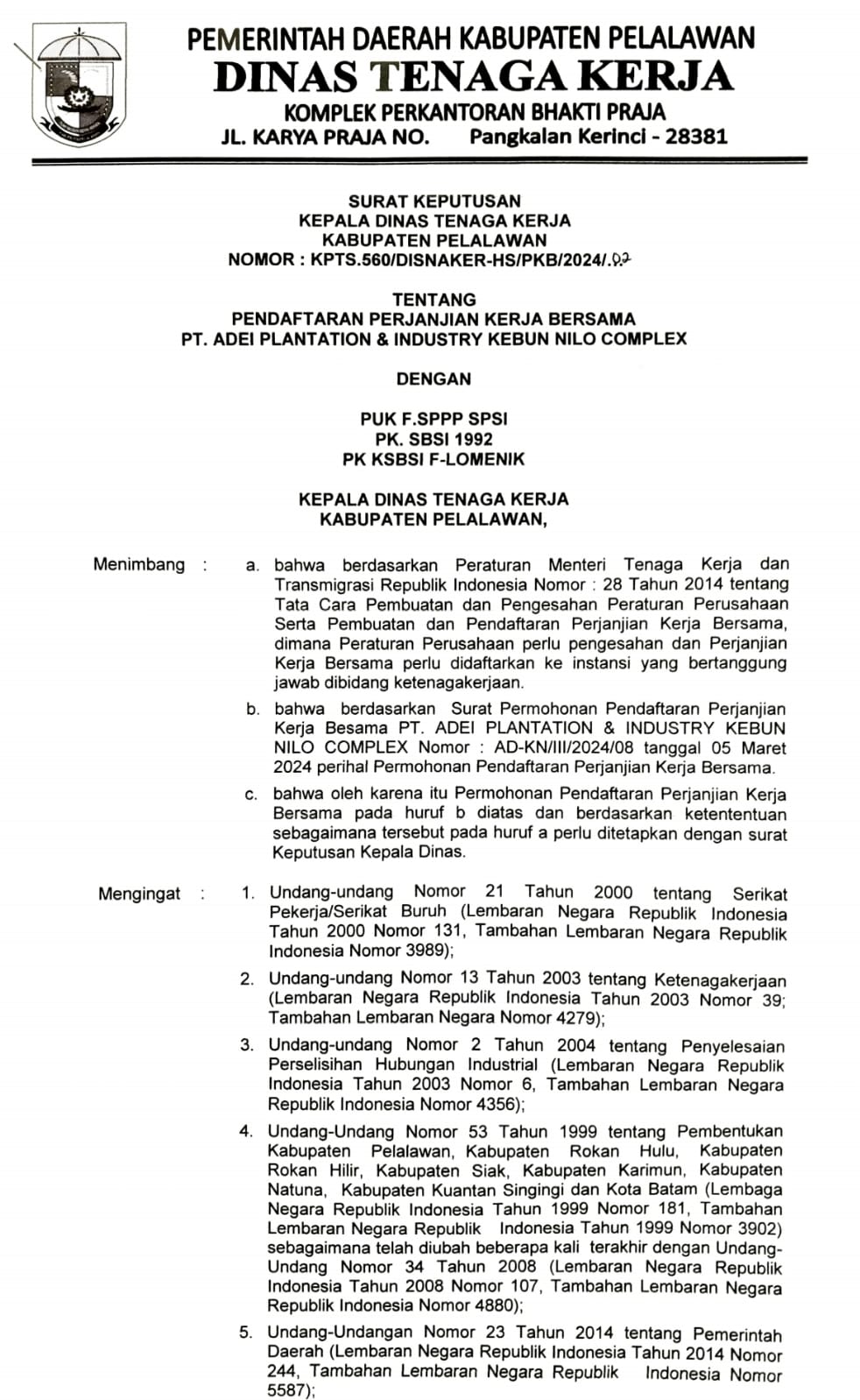 Pelalawan- KPonline – Prosedur penerbitan Surat Keputusan (SK) Pendaftaran Perjanjian Kerja Bersama (PKB) PT. ADEI Plantation & Industry periode 2023-2025, yang berunding bersama dengan tiga serikat pekerja/serikat buruh yang terdapat di perusahaan perkebunan kelapa sawit itu dinilai ngawur dan disinyalir cacat hukum.