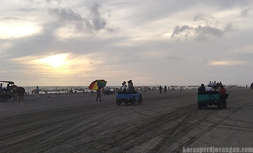 Deretan mobil jeep tanpa atap tampak menyisir garis pantai, membawa penumpang dari berbagai daerah luar kota. Tawa dan keceriaan terdengar jelas, menambah semarak suasana pantai yang ikonik ini. Sensasi berkendara di atas pasir pantai dengan pemandangan laut lepas menjadi pengalaman tak terlupakan bagi para pengunjung.