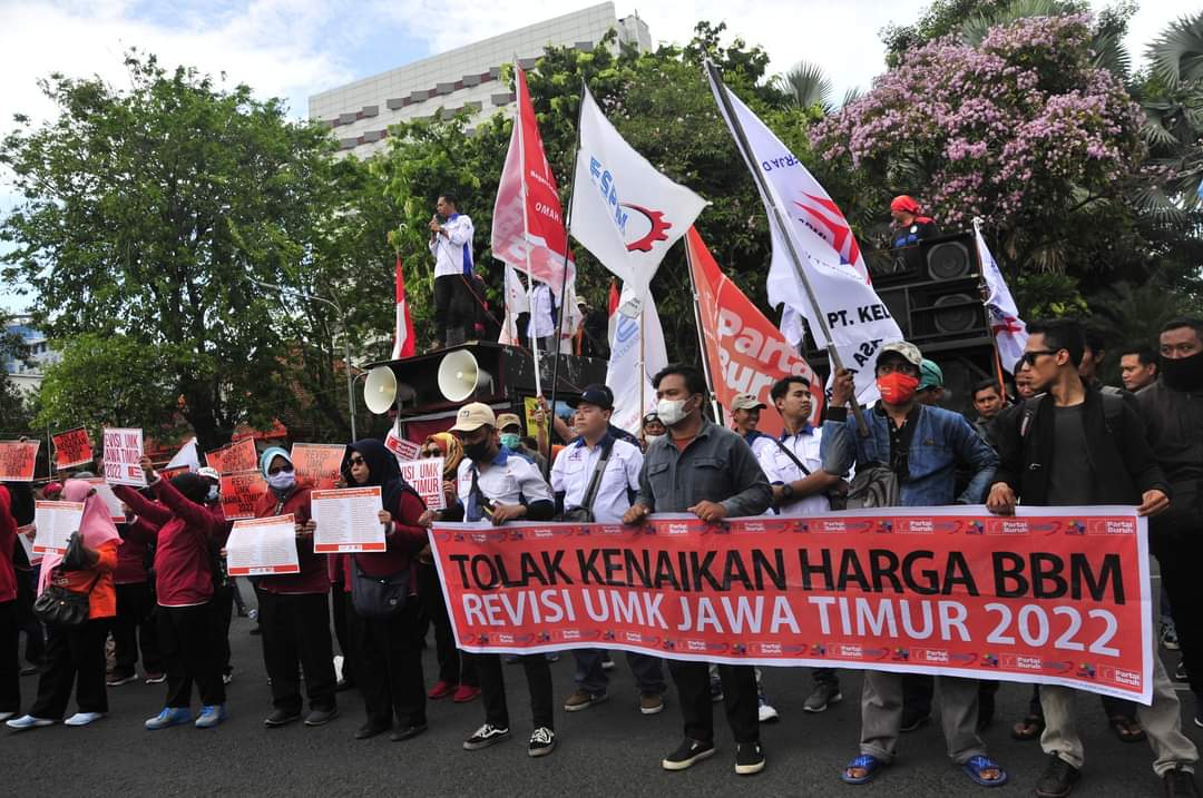 2. Mendesak Gubernur Jawa Timur agar merevisi Keputusan Gubernur Jawa Timur Nomor 188/803/KPTS/013/2021 tentang Upah Minimum Kabupaten/Kota (UMK) di Jawa Timur Tahun 2022. Naikkan UMK di Jawa Timur tahun 2022 sebesar 10%, sesuai dengan data Statistik yang mencatat pertumbuhan ekonomi Jawa Timur Triwulan II-2022 sebesar 5,74% pada triwulan II/2021 dan inflasi YoY (Juli 2021-Juli 2022) mencapai angka 5,39%.