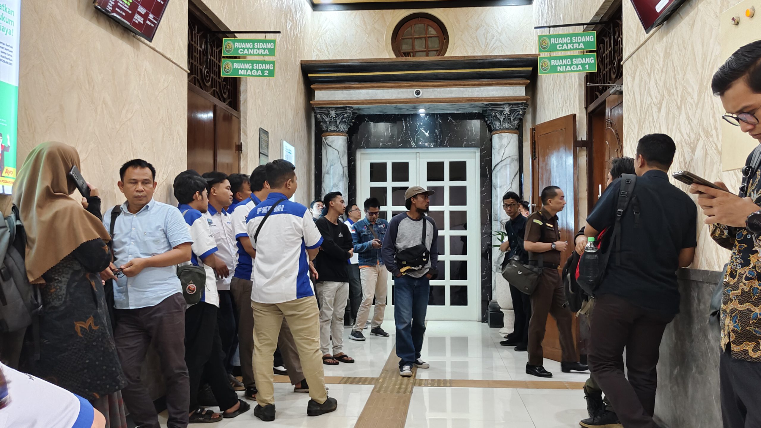 Mereka hadir di PN Surabaya dengan memakai Seragam Biru Putih FSPMI tidak hanya di depan Pengadilan , sebagian juga ada yang berada di dalam gedung Pengadilan.