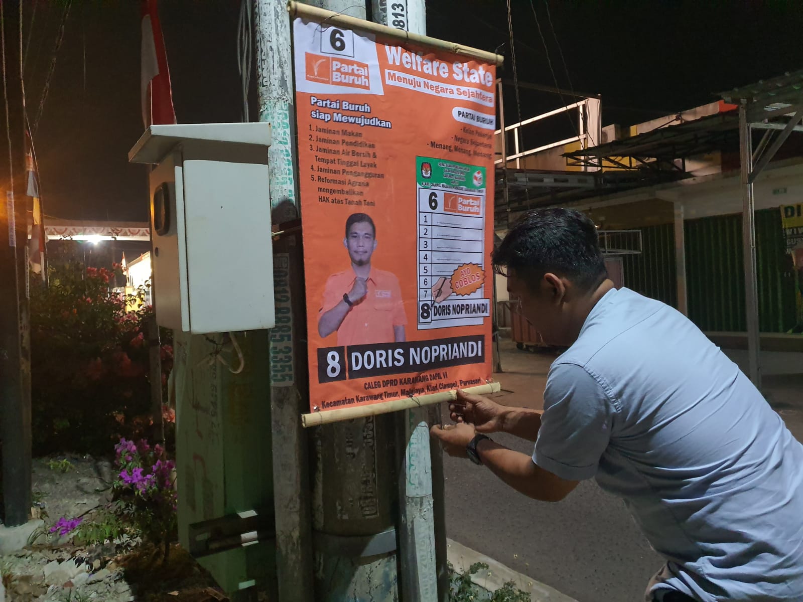 Karawang, KPonline – Dalam Sosialisasi Partai Buruh dan Pemenangan Partai Buruh Pada Jum’at Malam (25/08/2023) tim Sukses Calon Legislatif (Caleg) DPRD Kabupaten Karawang Doris Nopriandi Nomor 8 di Daerah Pemilihan (Dapil) Enam (6) pada pukul 21.00 WIB terlihat memasang banner pencalonan Caleg di wilayah Karawang Timur yang masuk dalam wilayah pemilihan Dapil 6 Kabupaten Karawang.