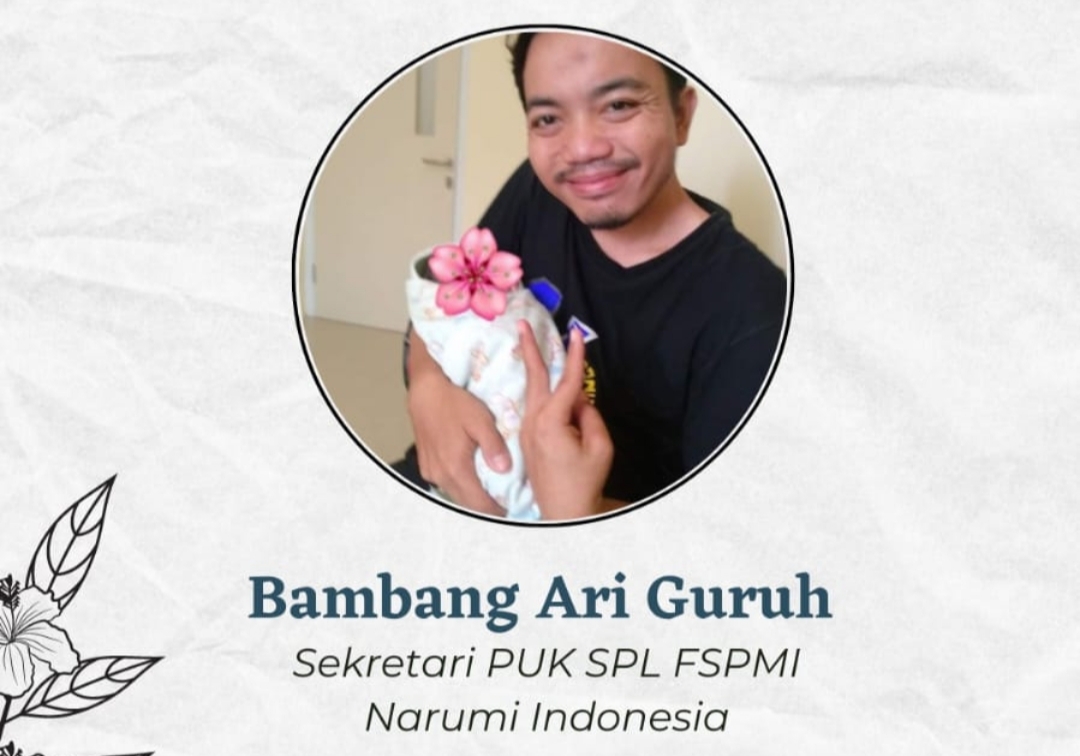 Bambang Ari Guruh, sekretaris PUK SPL FSPMI PT. Narumi Indonesia dikabarkan meninggal dunia. Pria yang dikenal sangat supel dan ramah dalam bergaul, bersahabat dan berkawan dengan siapa saja serta aktif dalam organisasi pergerakan bahkan hingga akhir hayatnya masih aktif sebagai sekretaris PUK SPL FSPMI PT. Narumi Indonesia.