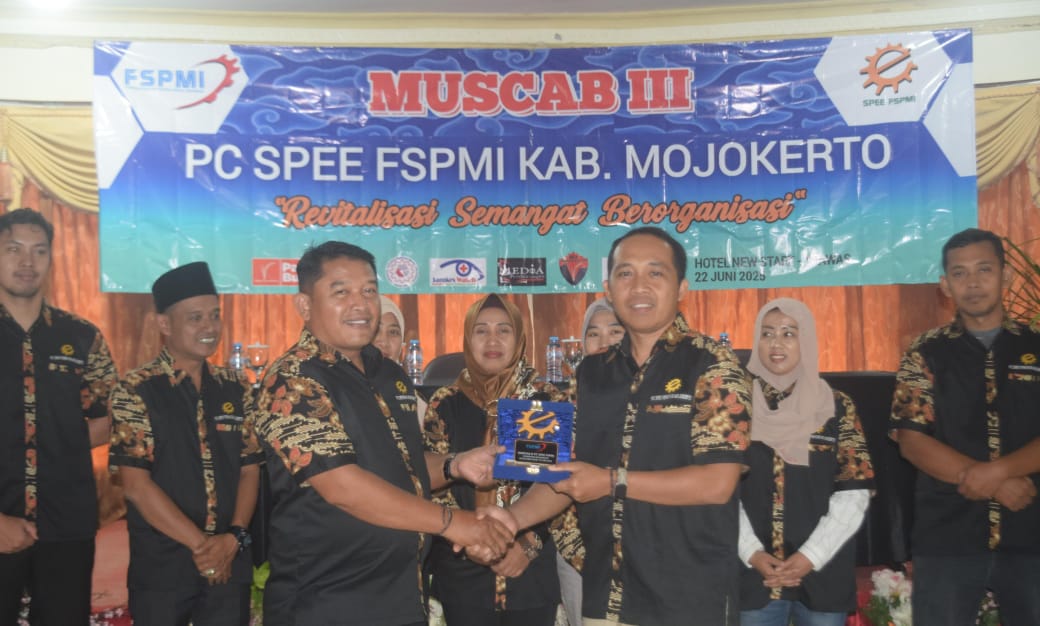 Prosesi serah terima jabatan ketua PC SPEE FSPMI Kabupaten Mojokerto hasil Muscab ke - 3, dari pimpinan sebelumnya Abdul Wahab (kiri) ke ketua baru periode 2025-2023 Khoirul Anam (kanan) di Hotel Newstar Trawas - Mojokerto (22/06/2025)