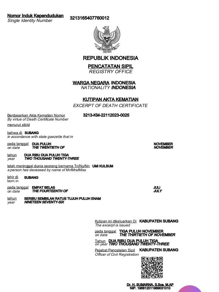 Subang,KPonline – Adalah Dede Sutisna, ahli waris dari almarhumah Umi kulsum peserta BPJS bukan penerima upah atau di singkat BPJS BPU dengan nomor KJP 23087849651 sudah menjadi peserta terhitung bulan Juli 2023, dan berakhir kepesertaan nya karena meninggal pada tanggal 20 Nopember 2023.