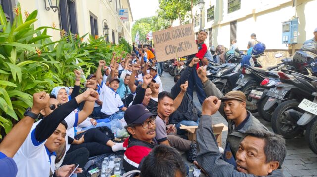 Surabaya, KPonline – Ribuan buruh yang tergabung dalam Federasi Serikat Pekerja Metal Indonesia (FSPMI) menggelar unjuk rasa di depan kantor Bank Prima, Jalan Jembatan Merah No. 7–9 Surabaya, Senin pagi selengkapnya