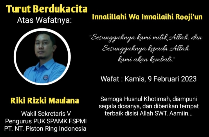 Karawang, KPonline – Innalillahi wa innailaihi rooji’un.. Telah berpulang ke Rahmatullah Rekan seperjuangan kita, Saudara tak sedarah, Rekan kerja kita Bung Riki Rizki Maulana. Wafat pada tanggal 9 Februari 2023 kurang lebih pukul 14.00 Wib saat dalam perjalanan menuju rumah sakit Lira Medika Karawang.