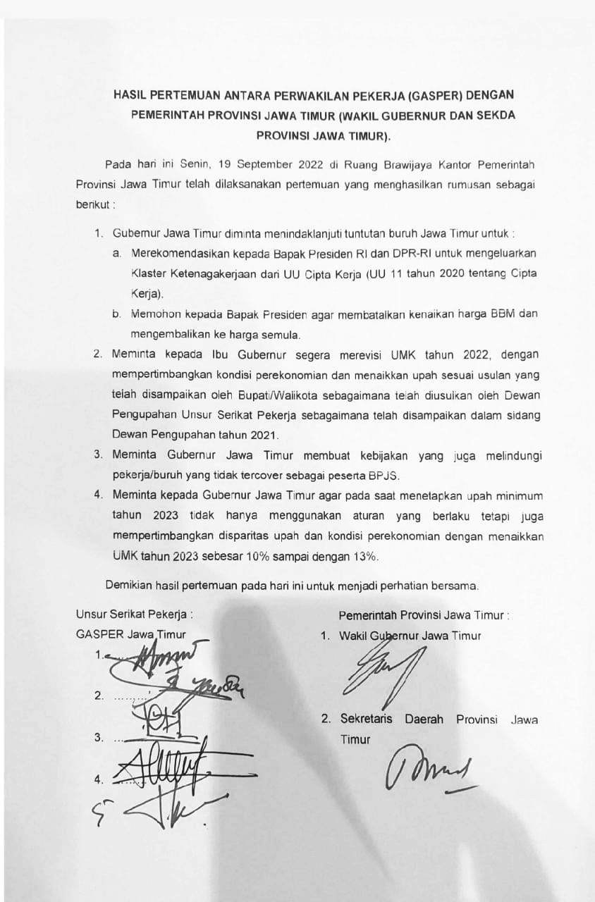 Dalam pertemuan yang di lakukan di ruang rapat Brawijaya kantor tersebut. Kedua belah pihak akhirnya menandatangani notulensi. Berikut hasil audensinya :
