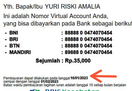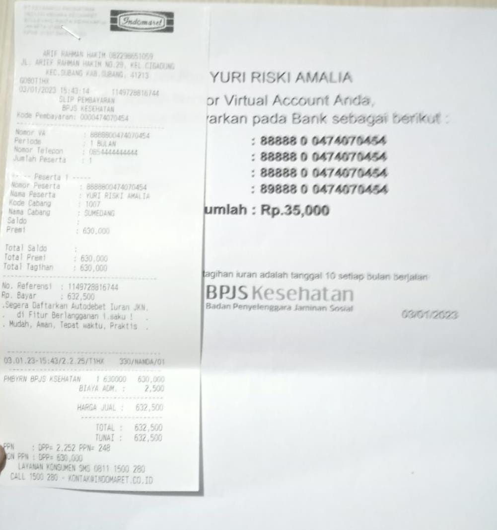 Akan tetapi pada hari selasa pukul 20.30 wib keluarga pasien memberi khabar kepada Eka andrianto melalui pesan WhatsApp bahwa virtual account BPJS kesehatan atas nama Yuri rizki amalia sudah bisa di bayarkan, tertera nilai di kwitansi pembayaran sebesar Rp.630.000, -, tertanggal 03-01-2023, 15:41:14.